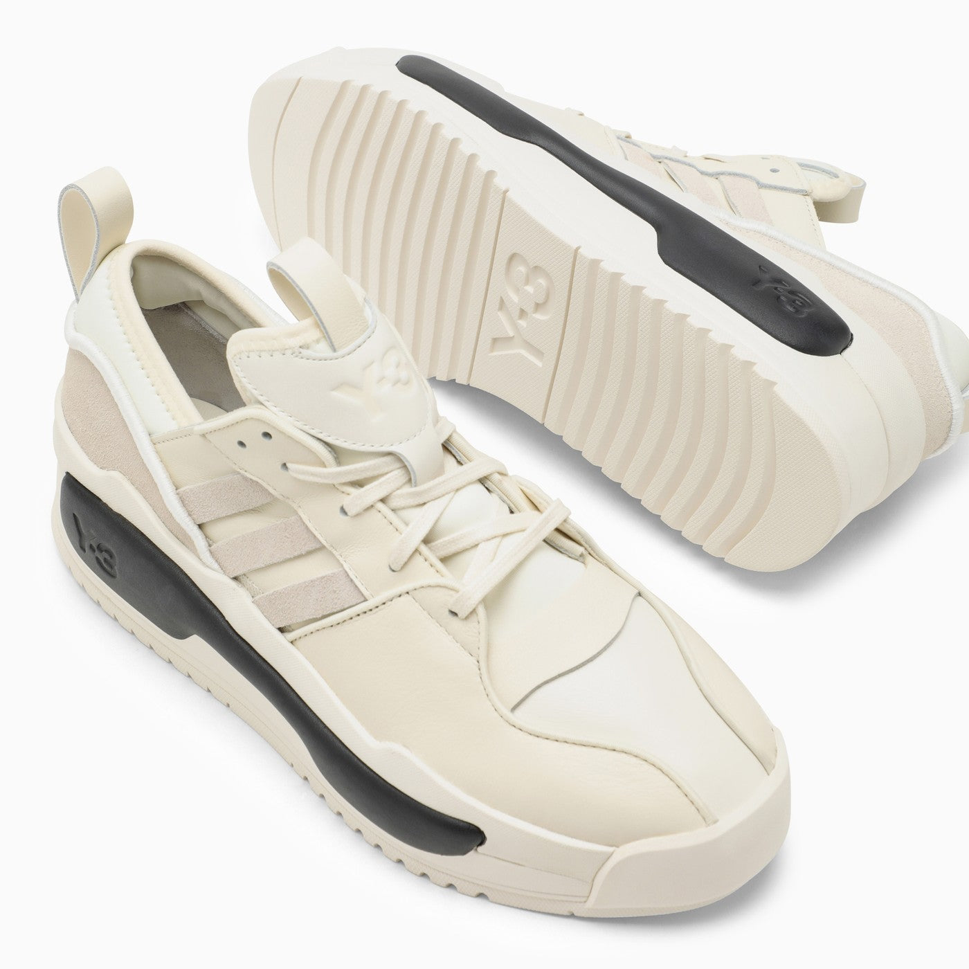 Allenatore basso color crema di Adidas Y-3 con una tomaia in pelle e neoprene, inserti a contrasto, un dito arrotondato, un fissaggio di lacci e una suola a logo contrastante.