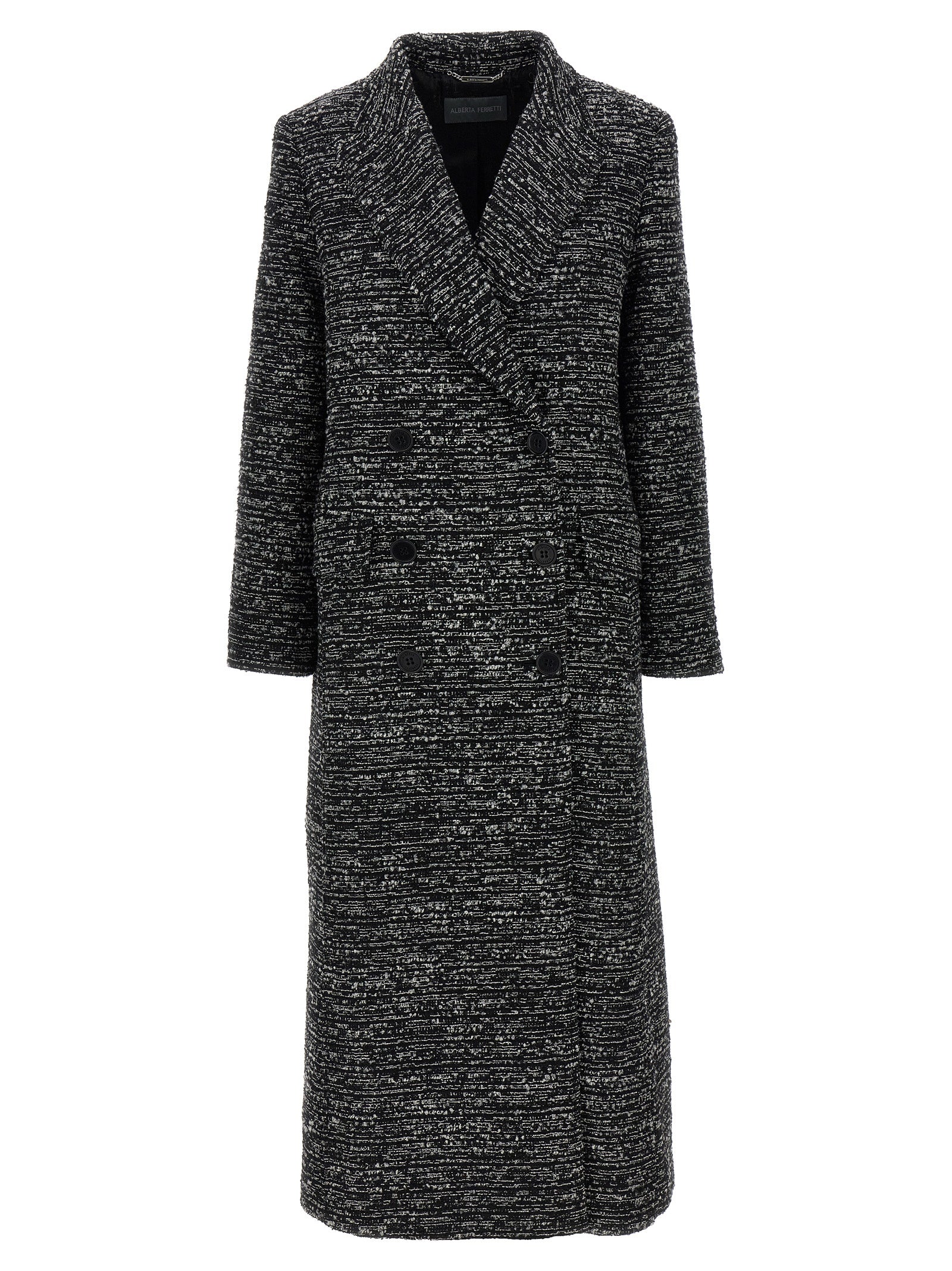 Coat lungo in tessuto boucle, modello a doppio petto con chiusura a bottone, tasche, spalline strutturate, maniche lunghe, prese d'aria posteriori.