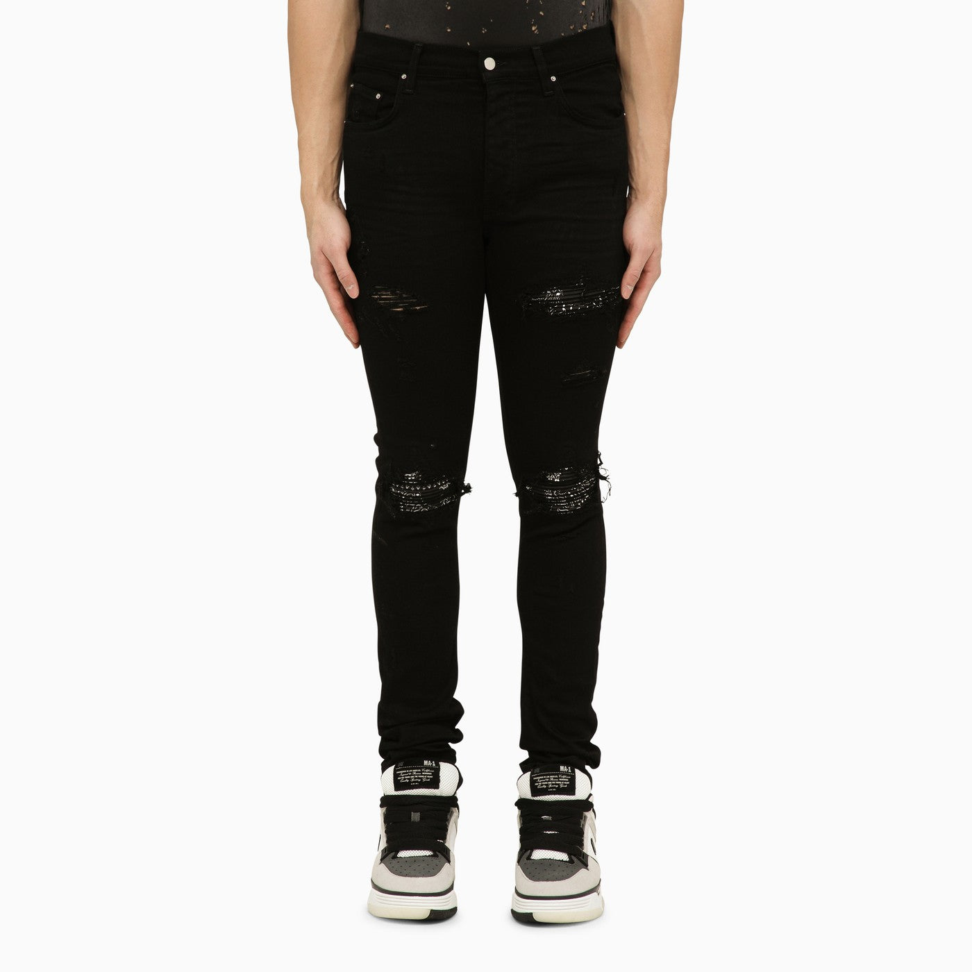 Jeans di Amiri in Black Stretch Cotton, con chiusura anteriore con zip e bottoni, anelli in cintura in vita, design a cinque tasche, patch di logo posteriore con stampe, lacrime sulla patch stampata con Avec mimetizzate e slim.