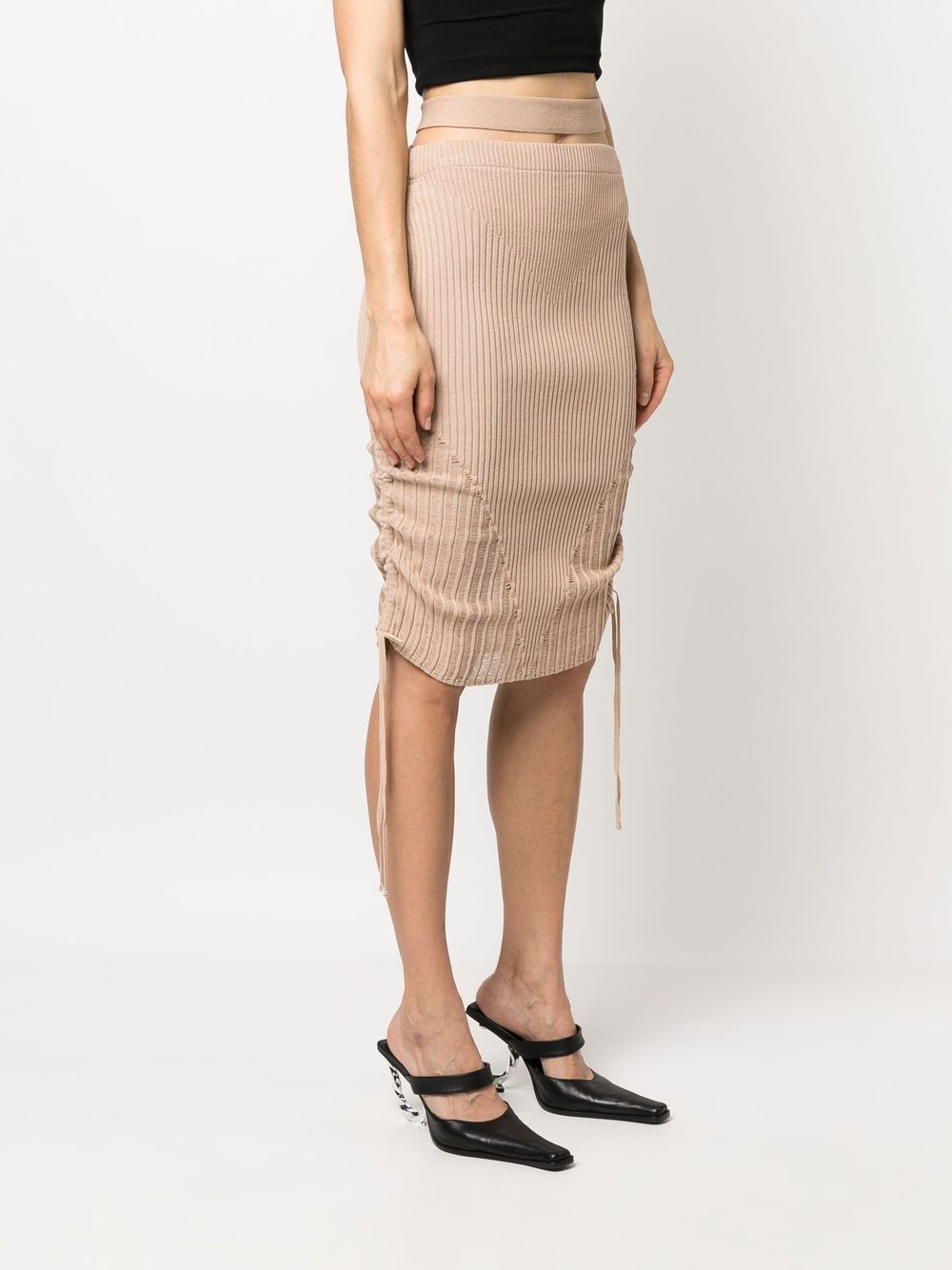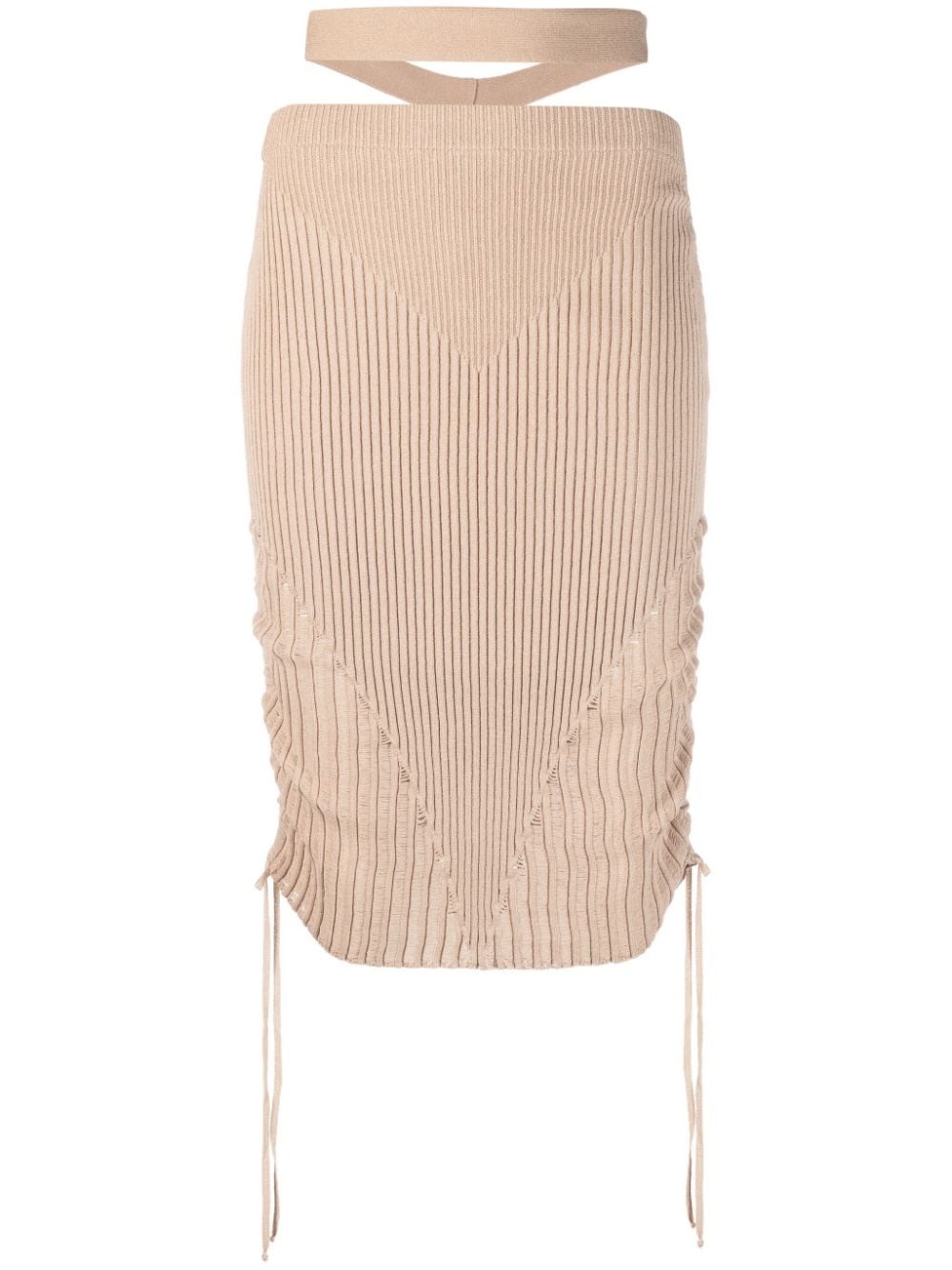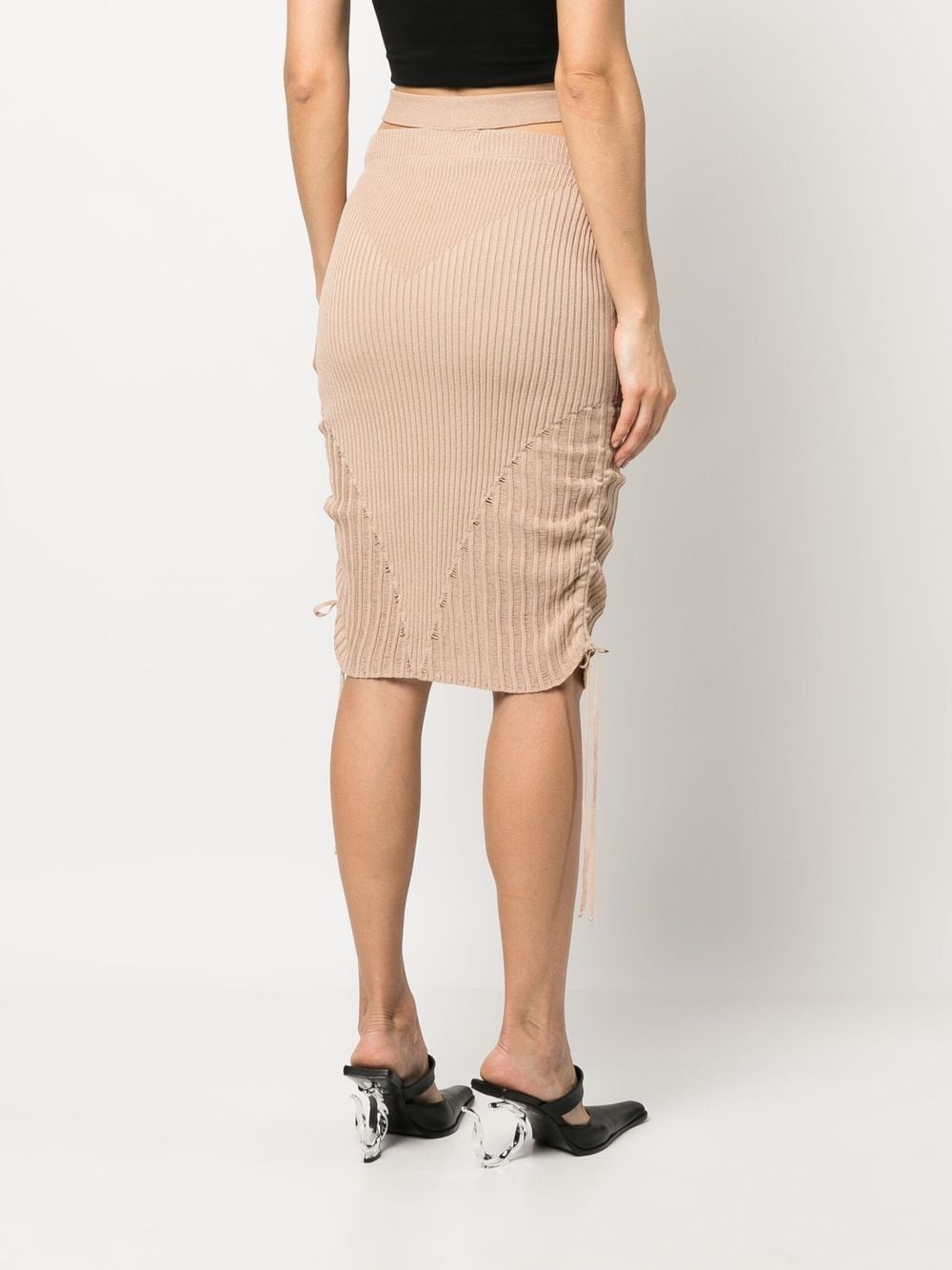 Gonna a matita a costiera a costine di Andreadamo con beige blush, maglia a coste, dettagli ritagliati, decnè allungati, orlo dritto e lunghezza del ginocchio.
