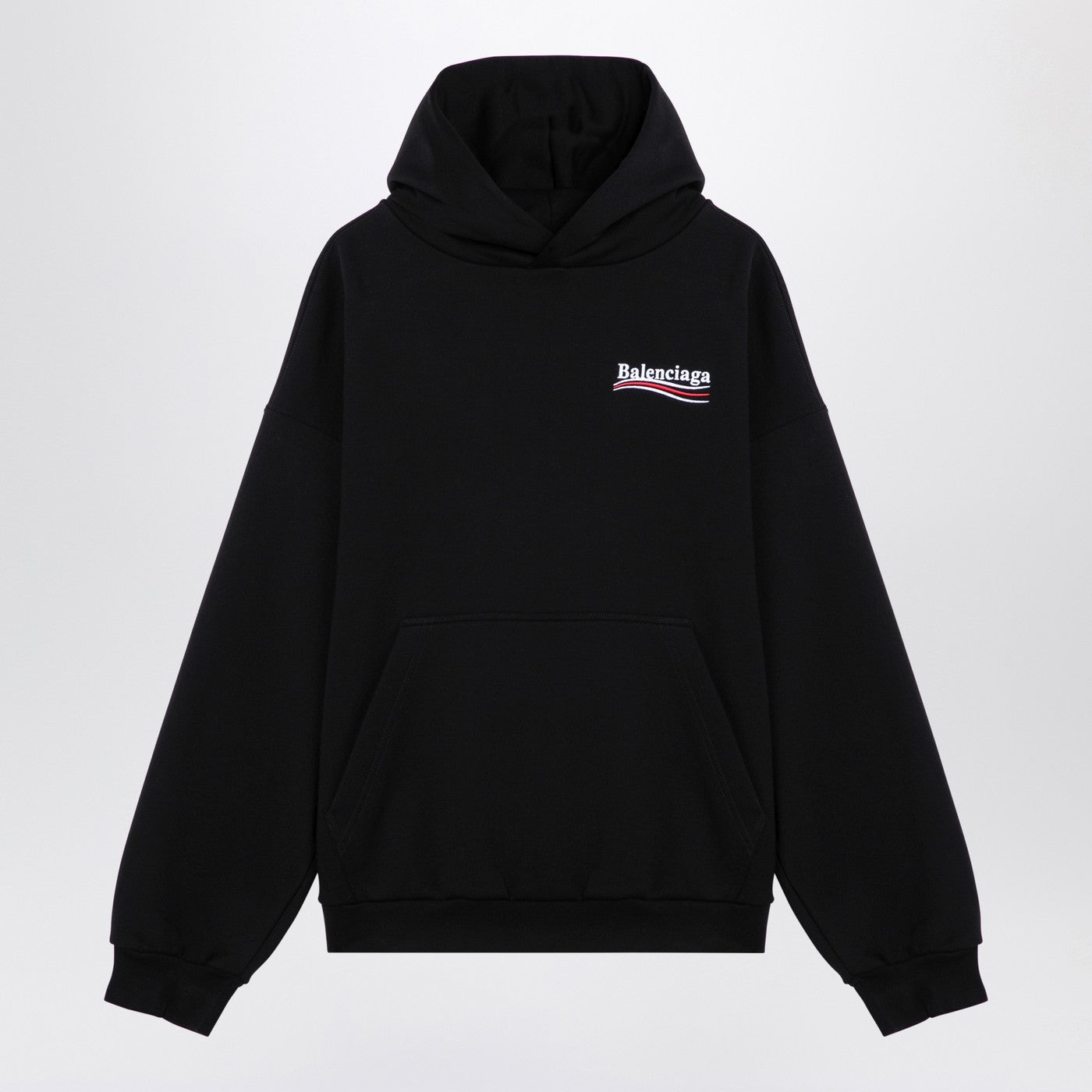 Felpa felpa con cappuccio di Balenciaga in cotone nero, con una stampa politica della campagna sul petto e sul retro, la tasca della custodia anteriore, le maniche lunghe, i polsini a coste e l'orlo.