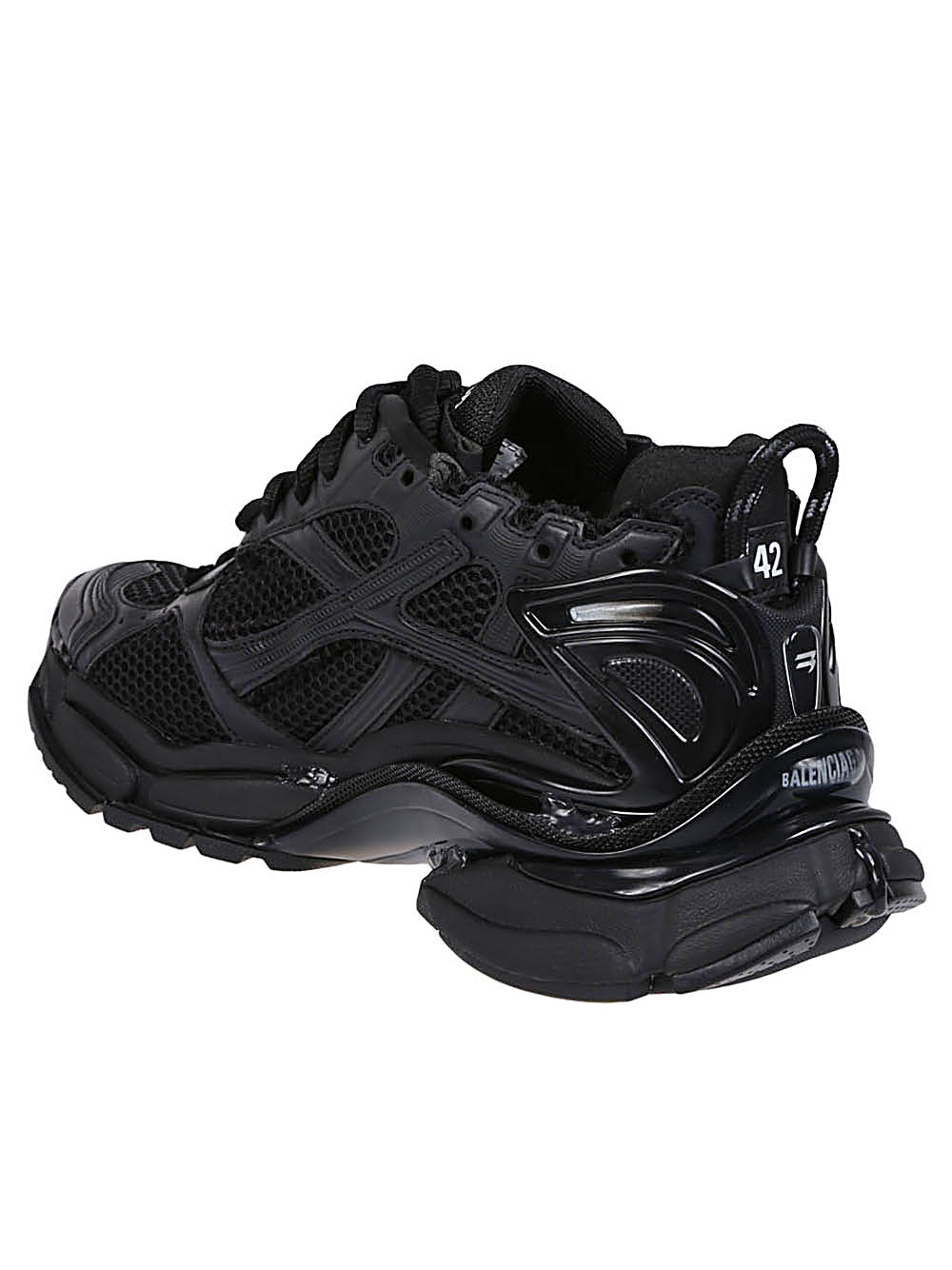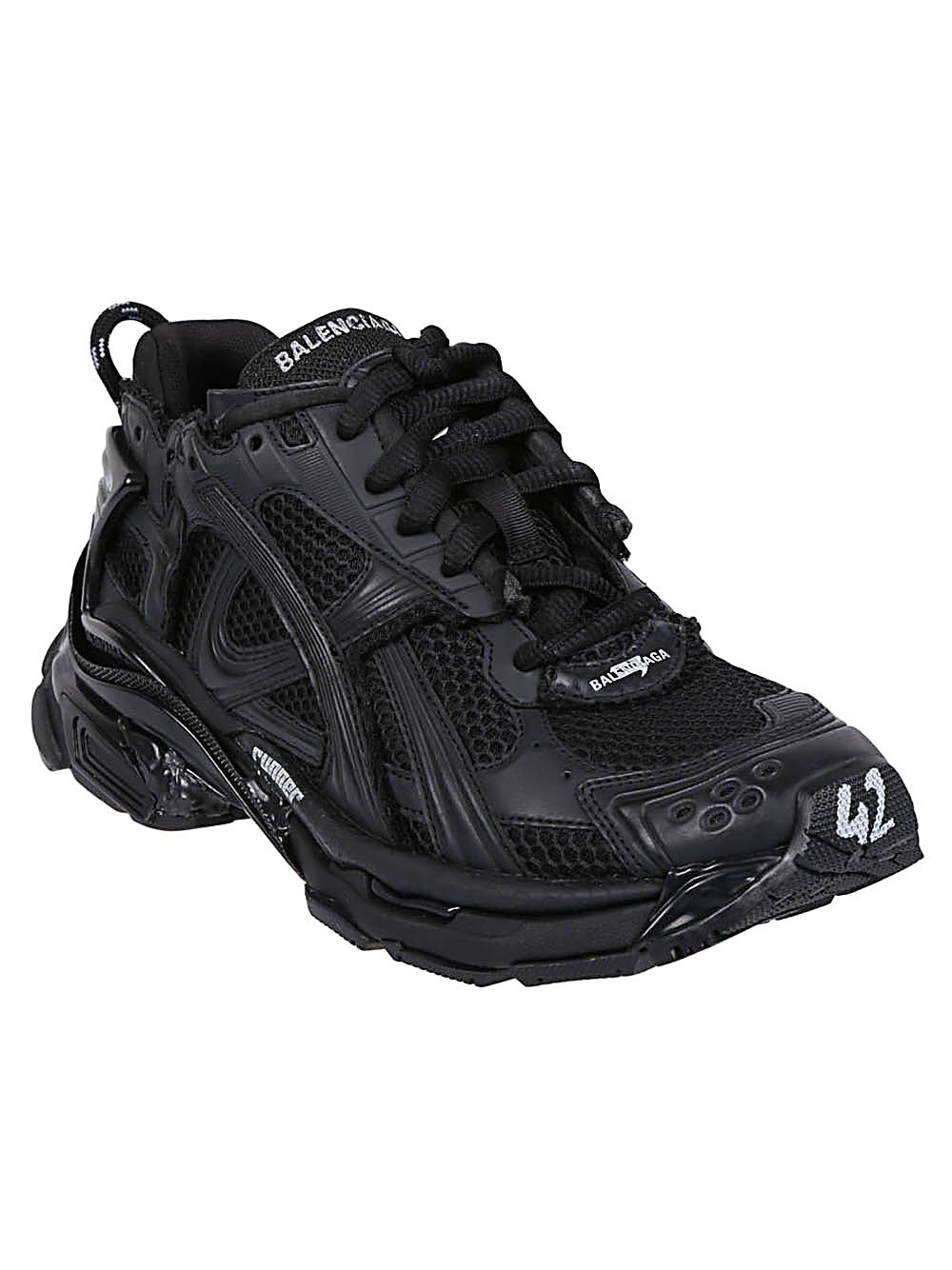 Black sneaker, with a consumed effect, imprinted size posteriorly, cut printed on the edge on the tip, externally printed runner logo, Balenciaga logo on the tongue and on the back.