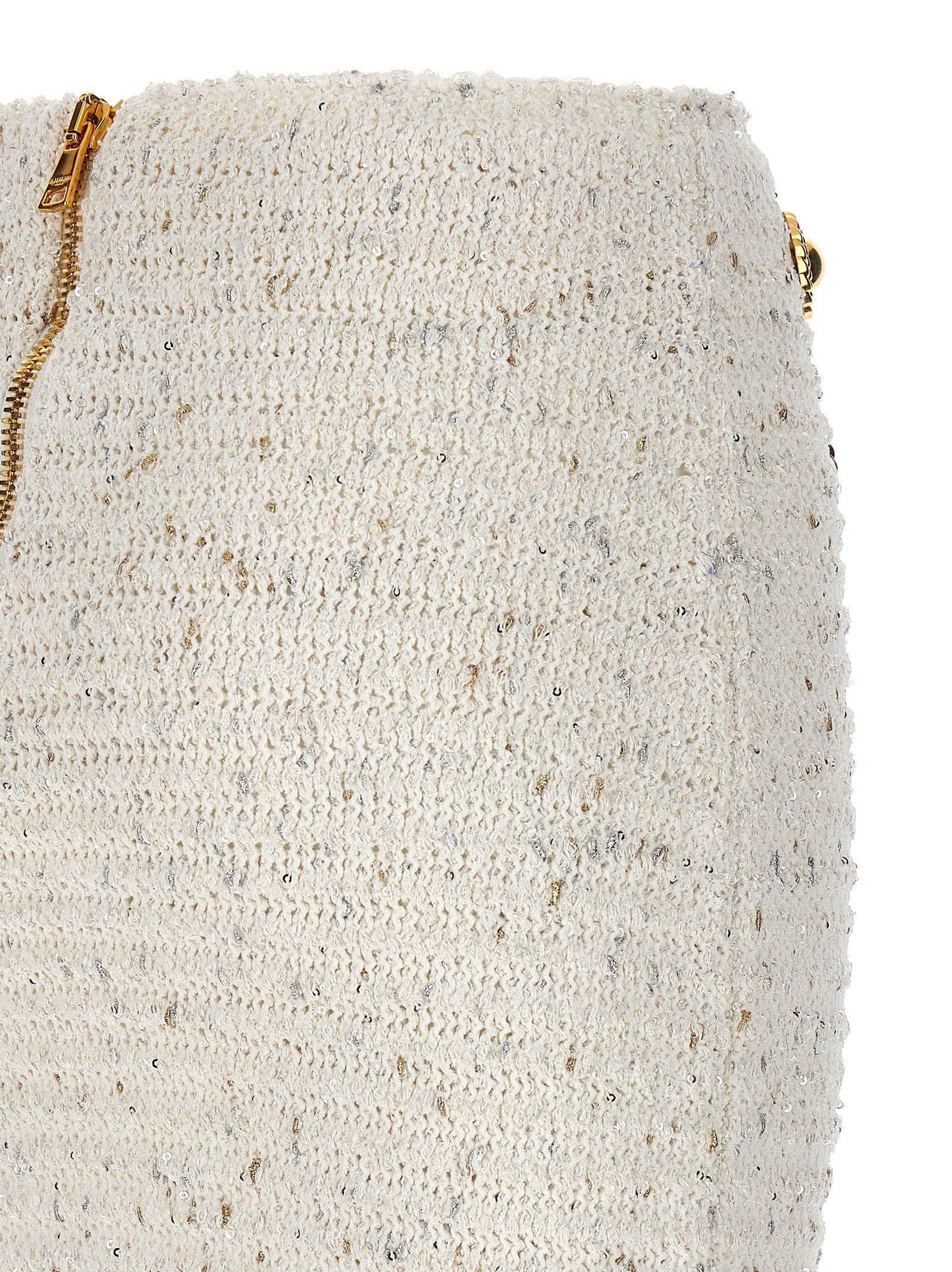 Gonna in tweed "Fringed Tweed" con paillettes e frange sull'orlo, pulsanti del logo anteriore, chiusura a zip posteriore.