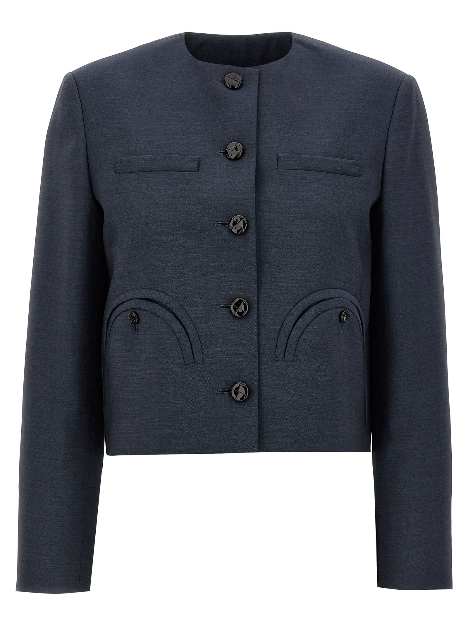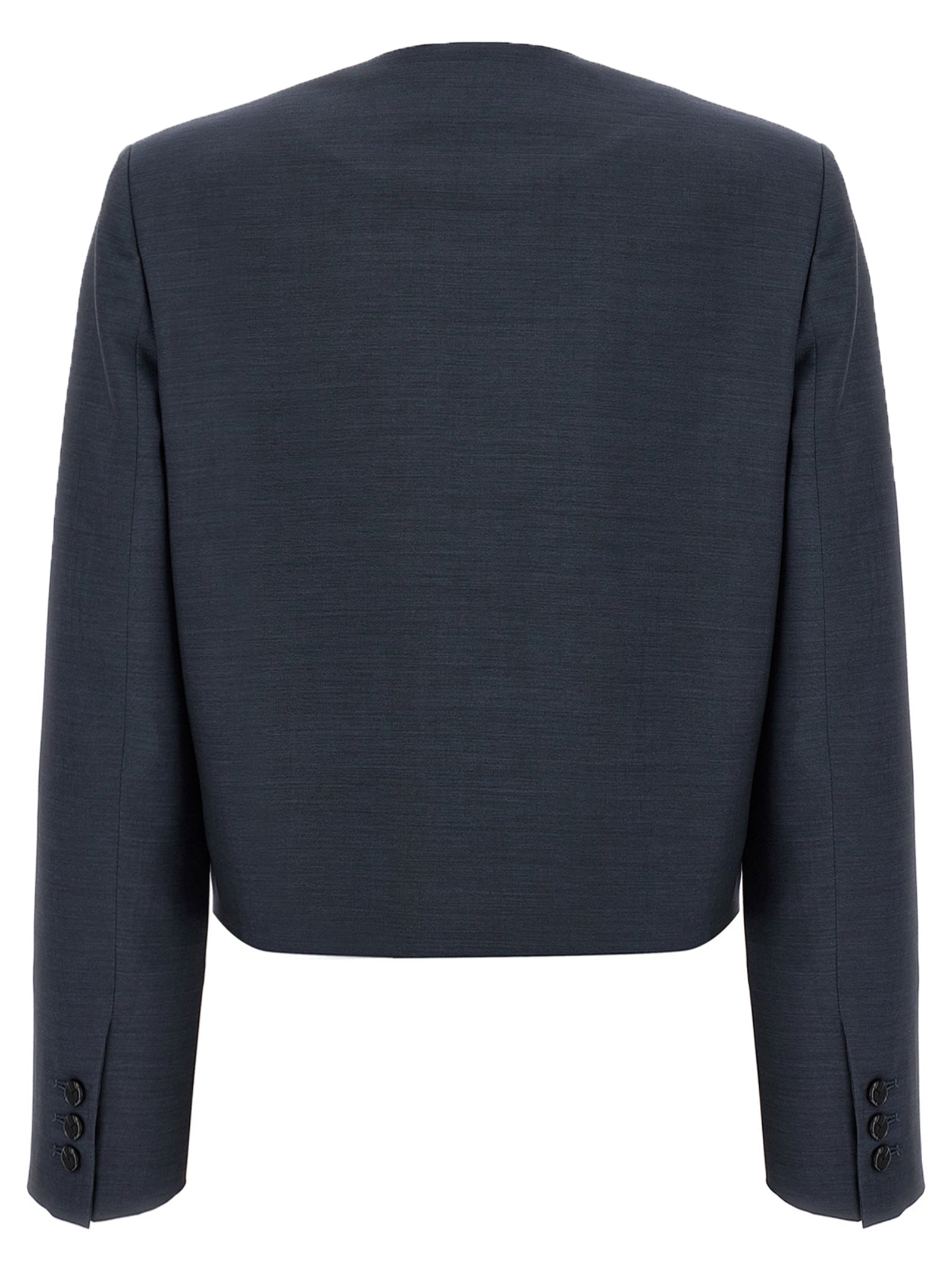 Blazer bolero a petto "aile shamo" in lana vergine e mohair con la chiusura dei bottoni, il collo dell'equipaggio, le tasche, le spalle imbottite, le maniche lunghe, il rivestimento della viscosa.