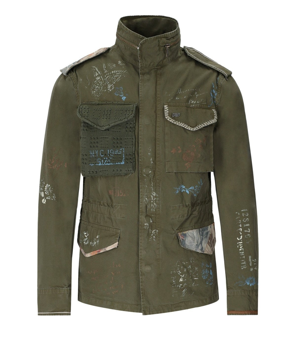Giacca dell'esercito di Bob Made di cotone, caratterizzata da scritti dipinti a mano in sfumature di verde militare. Dotato di una chiusura con una cerniera nascosta da bottoni di metallo dorato, presenta maniche lunghe con polsini abbottonati e quattro tasche anteriori con bottoni. Foccato internamente, ha un cofano interno. Collare finito con cerniere. Adattamento regolare. Questo articolo ha una piccola vestibilità, ti consigliamo di acquistare una taglia più grande del solito. Composizione: cotone 100%.