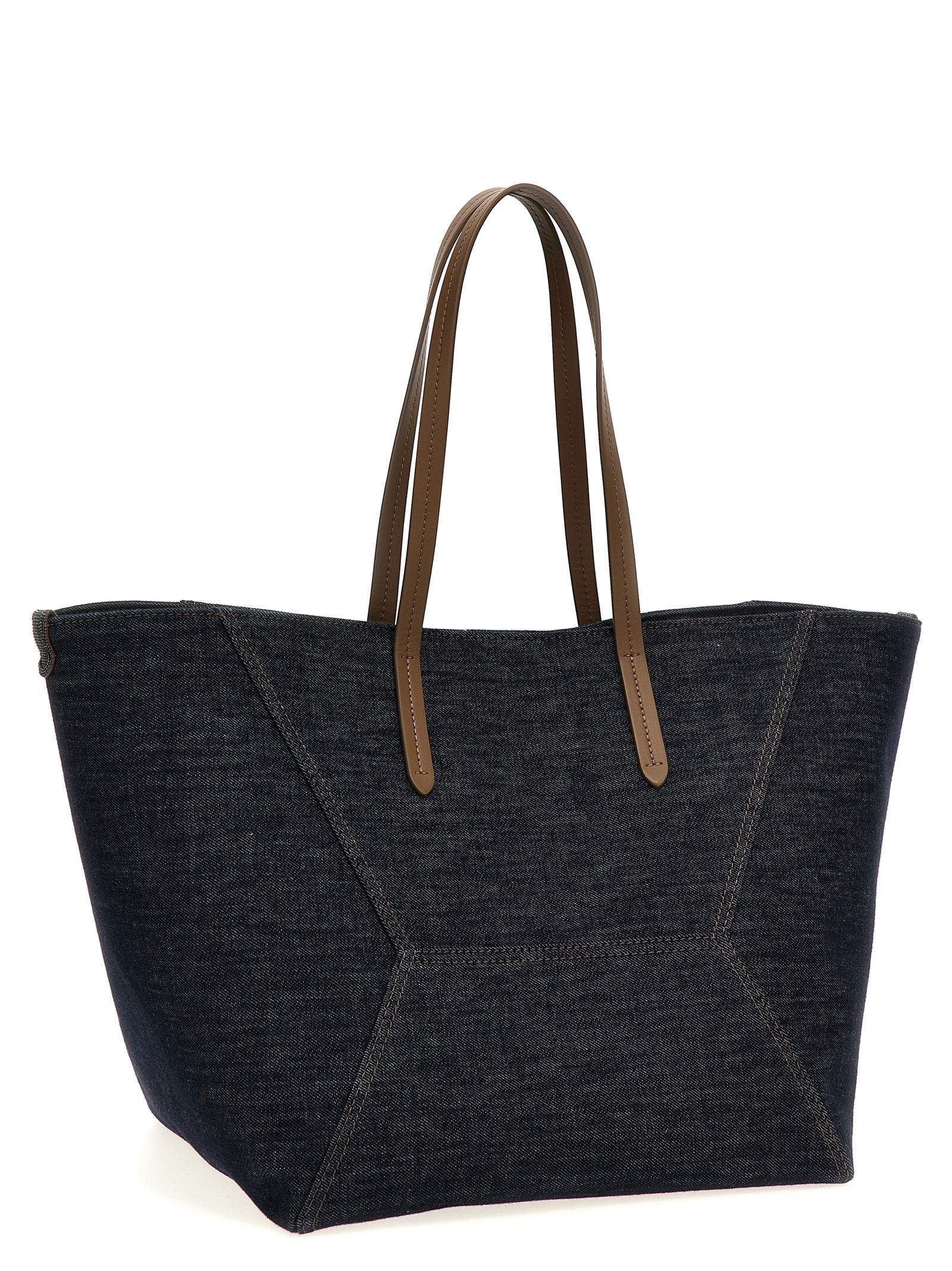 Borsa per la spesa in denim in cotone "Duo BC" con doppia maniglia in pelle, logo in rilievo anteriore, chiusura magnetica, dettagli monili laterali.
