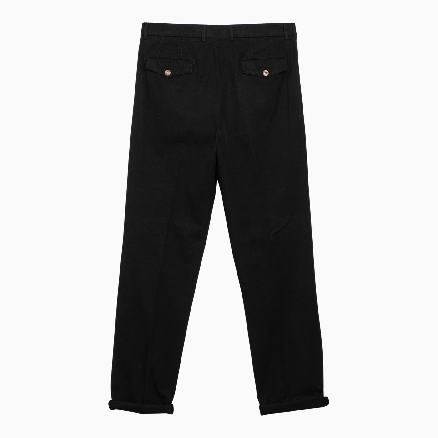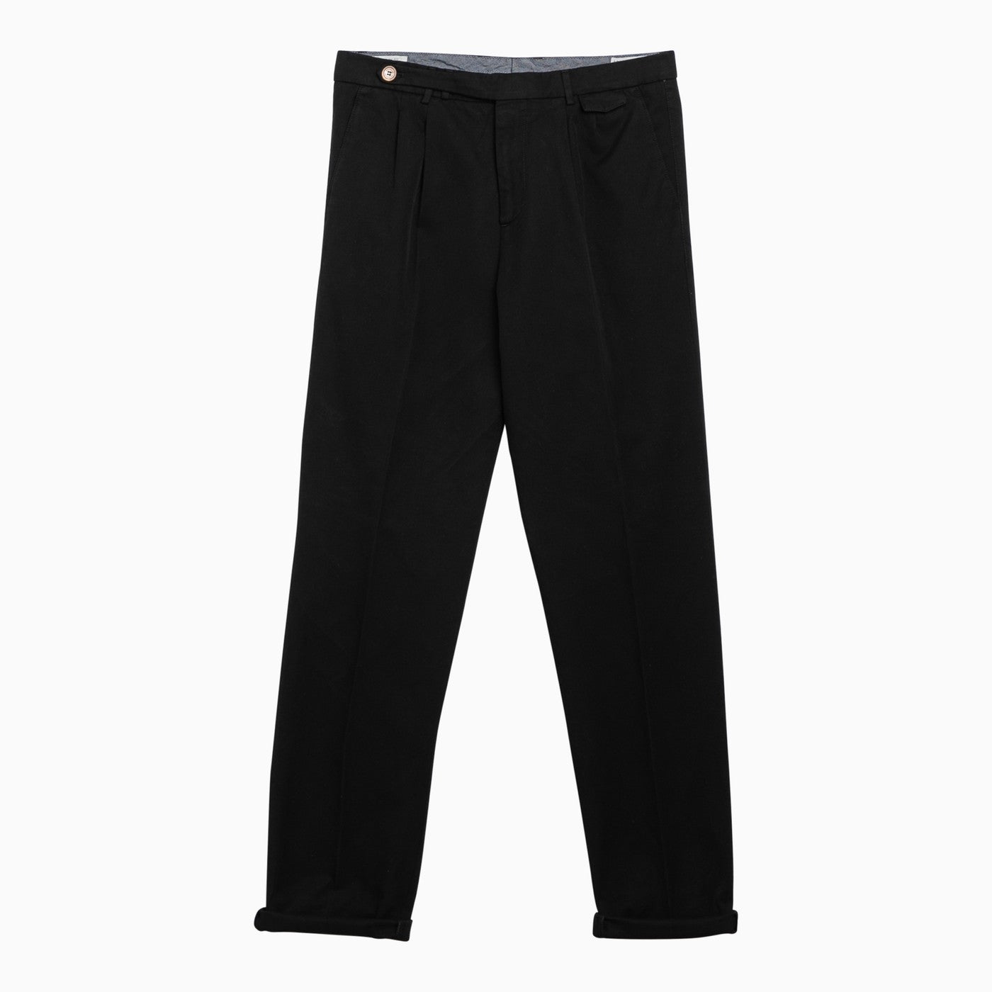 Pantaloni di cotone nero di Brunello Cucinelli con una mosca zip e abbottonatura, cicli a cinghia, pieghe anteriori, tasche laterali, tasche sul retro e bottoni e un orlo acceso.