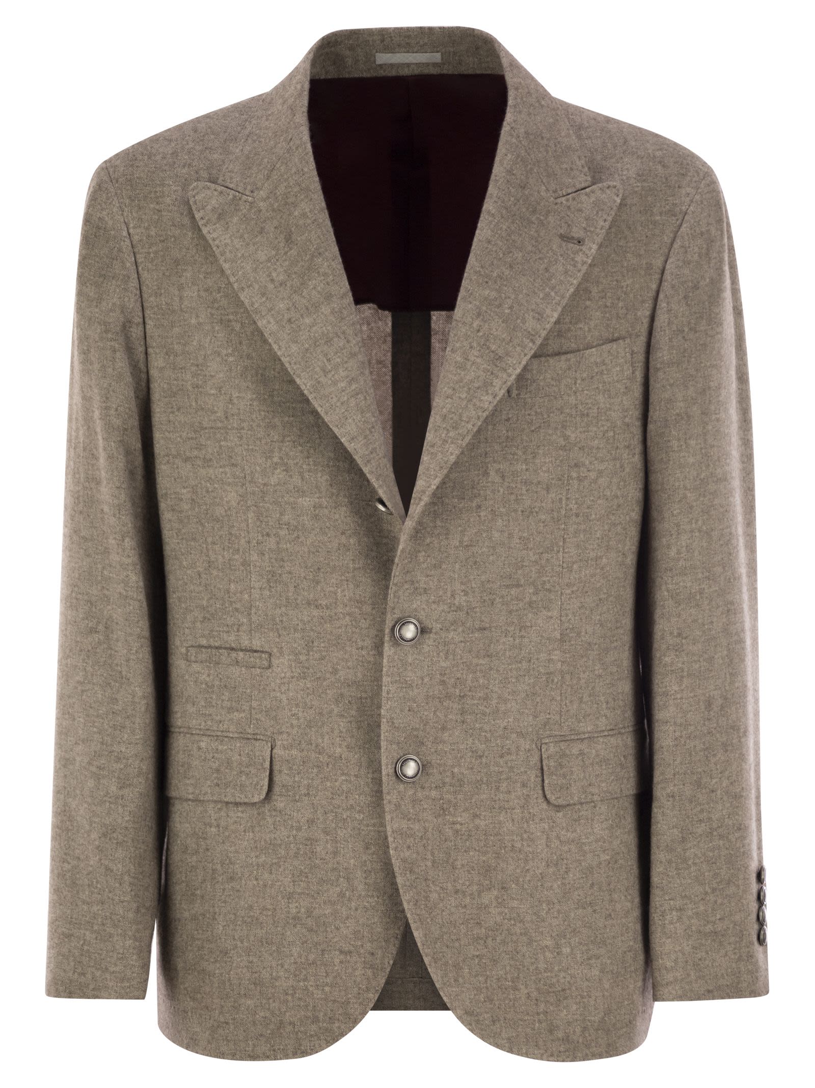 I materiali sofisticati interpretano lo spirito contemporaneo della giacca decostruita con grandi risvolti a punta e bottoni di metallo. La "spalla Solomeo", che prende il nome dal villaggio in cui si basa la compagnia, distingue la giacca Brunello Cucinelli con proporzioni distintive. La linea del secco e allo stesso tempo importante spalla migliora il fisico maschile, senza la necessità di imbottitura. Le fibre di yack lunghe e soffici danno al tessuto una mano morbida. La fodera leggera Cupro perfeziona il comfort del capo. - Tre fissaggio a bottone in metallo con due - grandi risvolti a punta - tasche Welt con lembo e tasca del seno - polsini con quattro pulsanti e loop di apertura - doppia fessura posteriore - Mezzo Cupro rivestimento ID designer: MD9667BFDJ C003