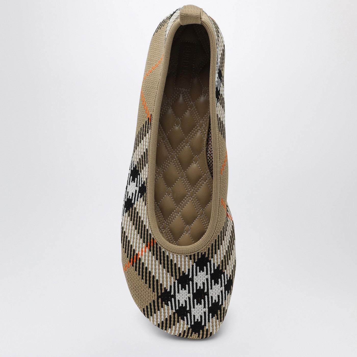 Ballerina a mezzi di nylon a maglia di Burberry, con un modello di controllo color sabbia, una punta strappata, una soletta trapuntata e un logo di design del cavaliere equestre sulla suola.