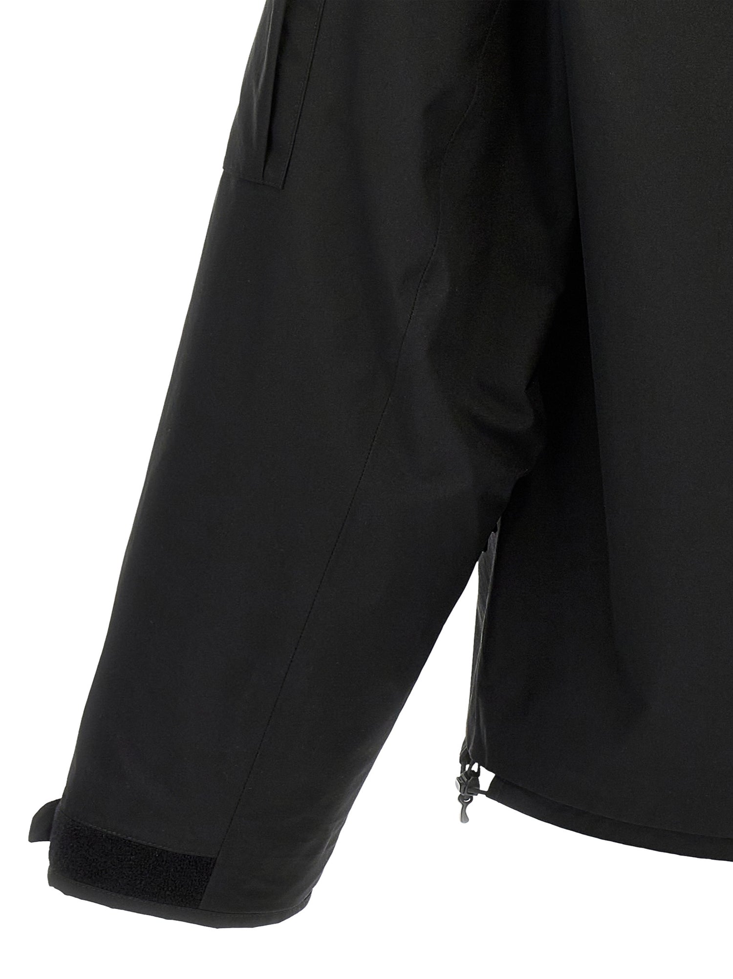 La giacca Gore-Tex Infinium ™ della serie Metropolis con collo alto, cappuccio, chiusura a zip, tasche a coulisse regolabili sull'orlo, maniche lunghe con polsini regolabili e stampa logo.