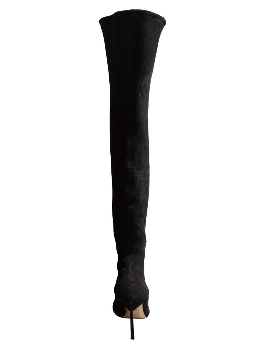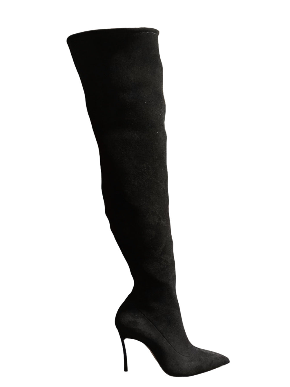 Realizzati in Italia, questi stivali con tacco affilato realizzati in ecologio nero abbracciano la gamba come una seconda pelle, garantendo una vestibilità perfetta.