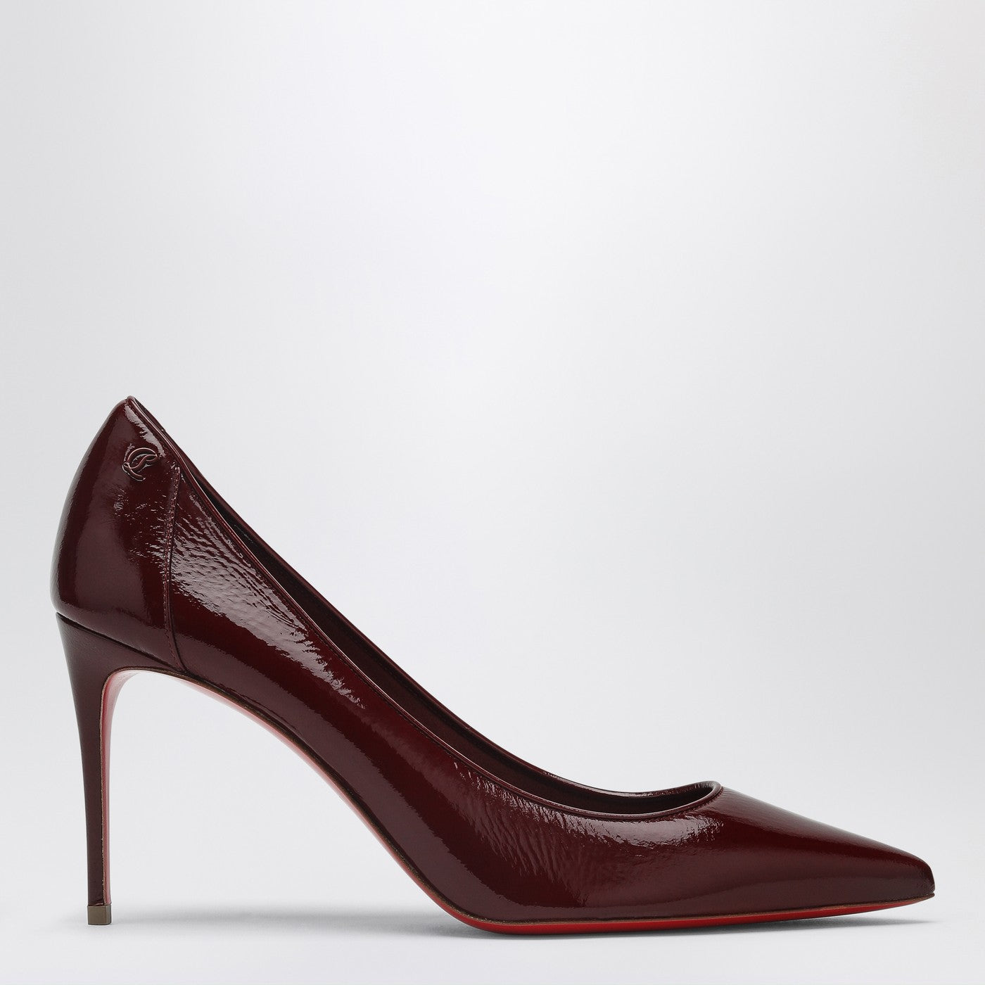 Brown patent leather décollette by Christian Louboutin, featuring a slim heel, a pointed toe design, small metal logo on the side and a contrasting leather sole.