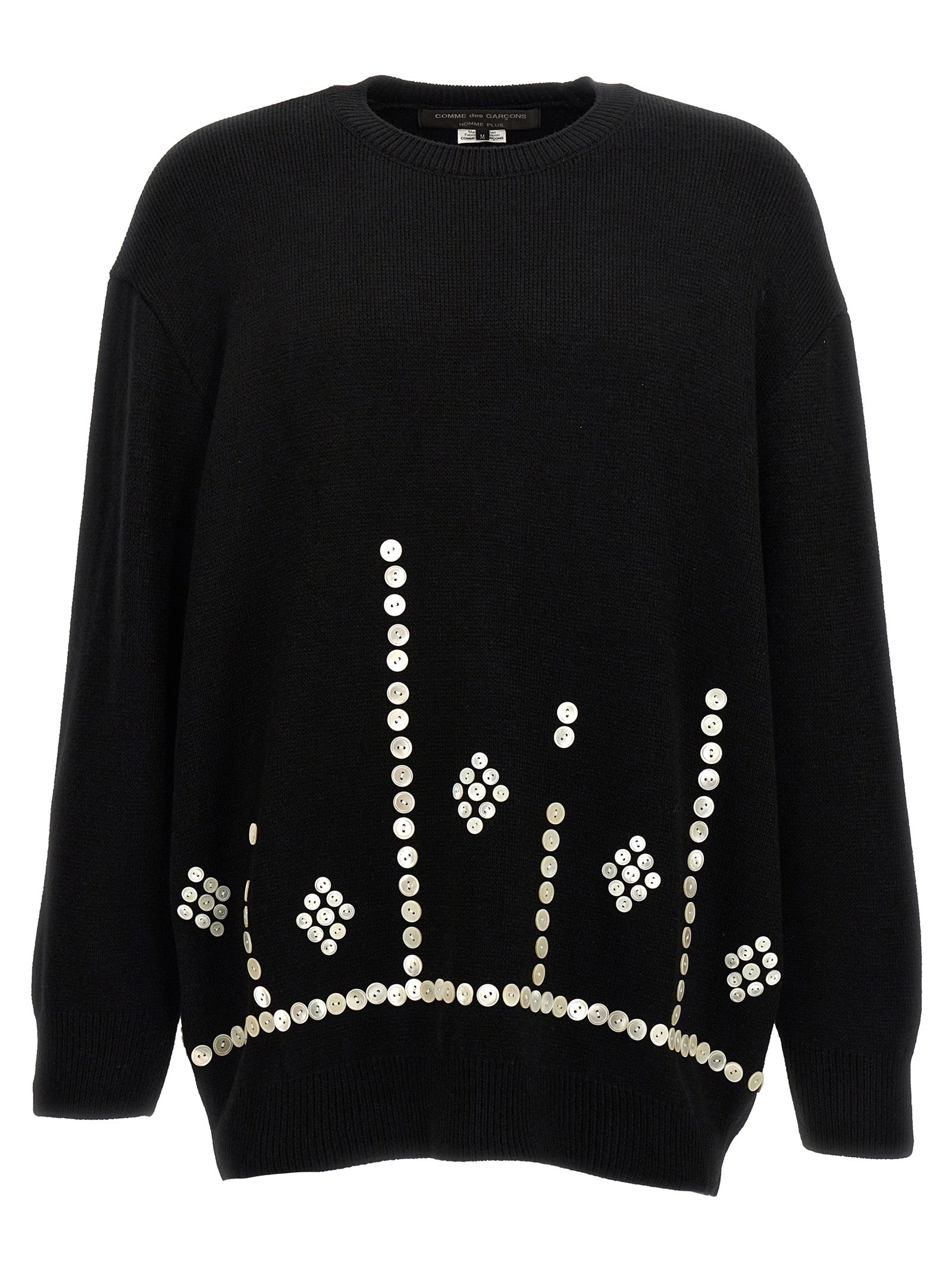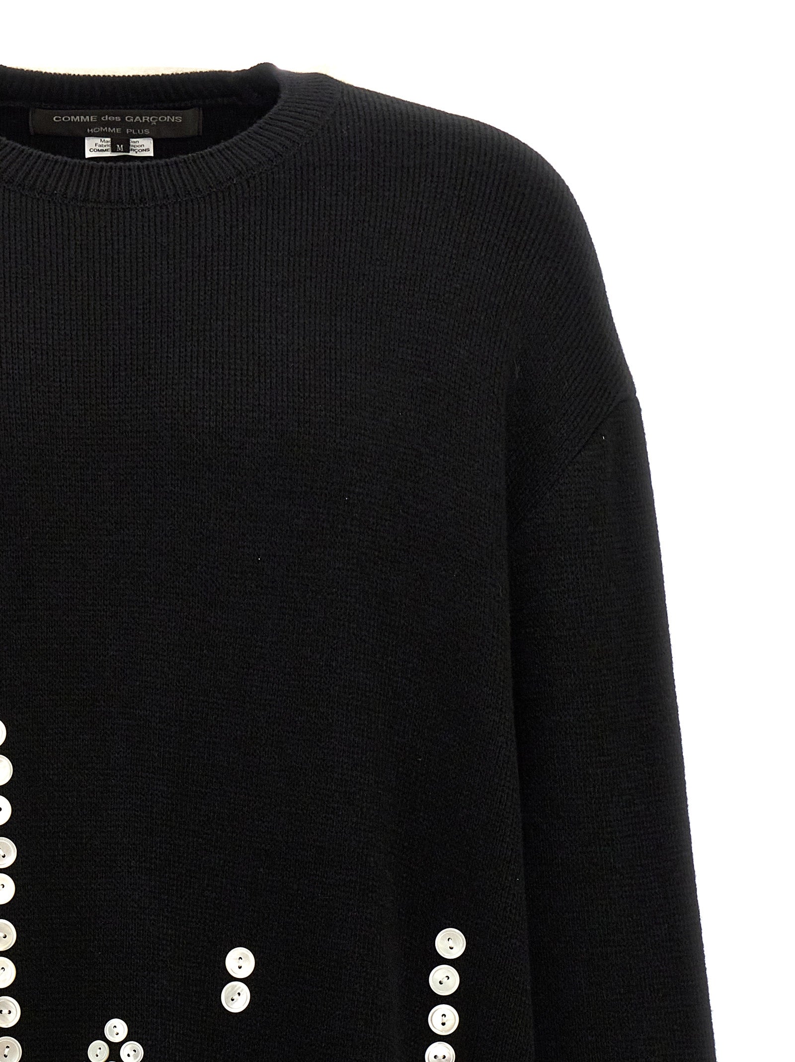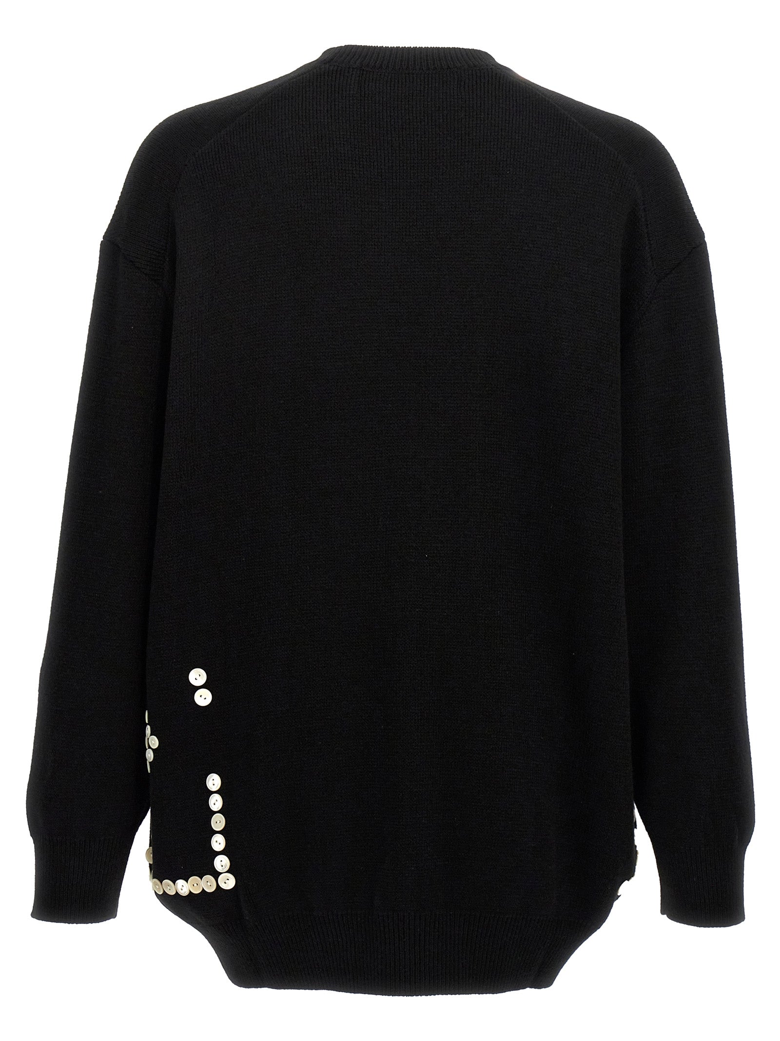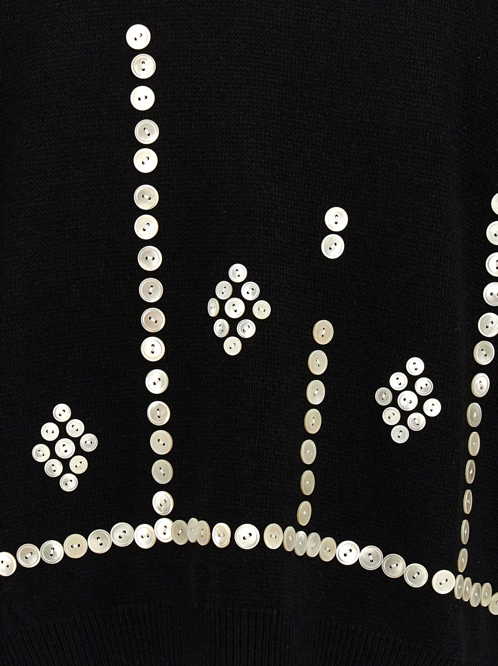 Maglione di miscela di lana con appliqué a bottone, collo dell'equipaggio, maniche a fanatico lungo.