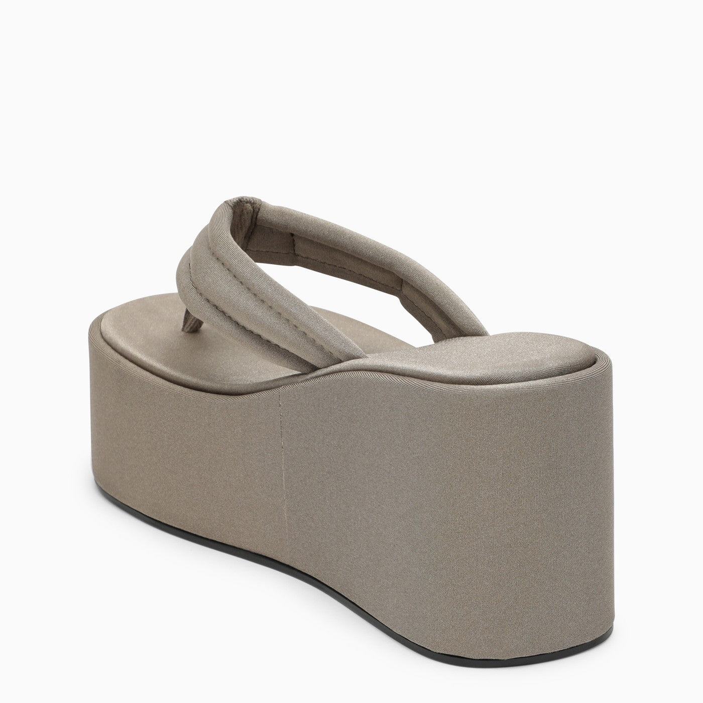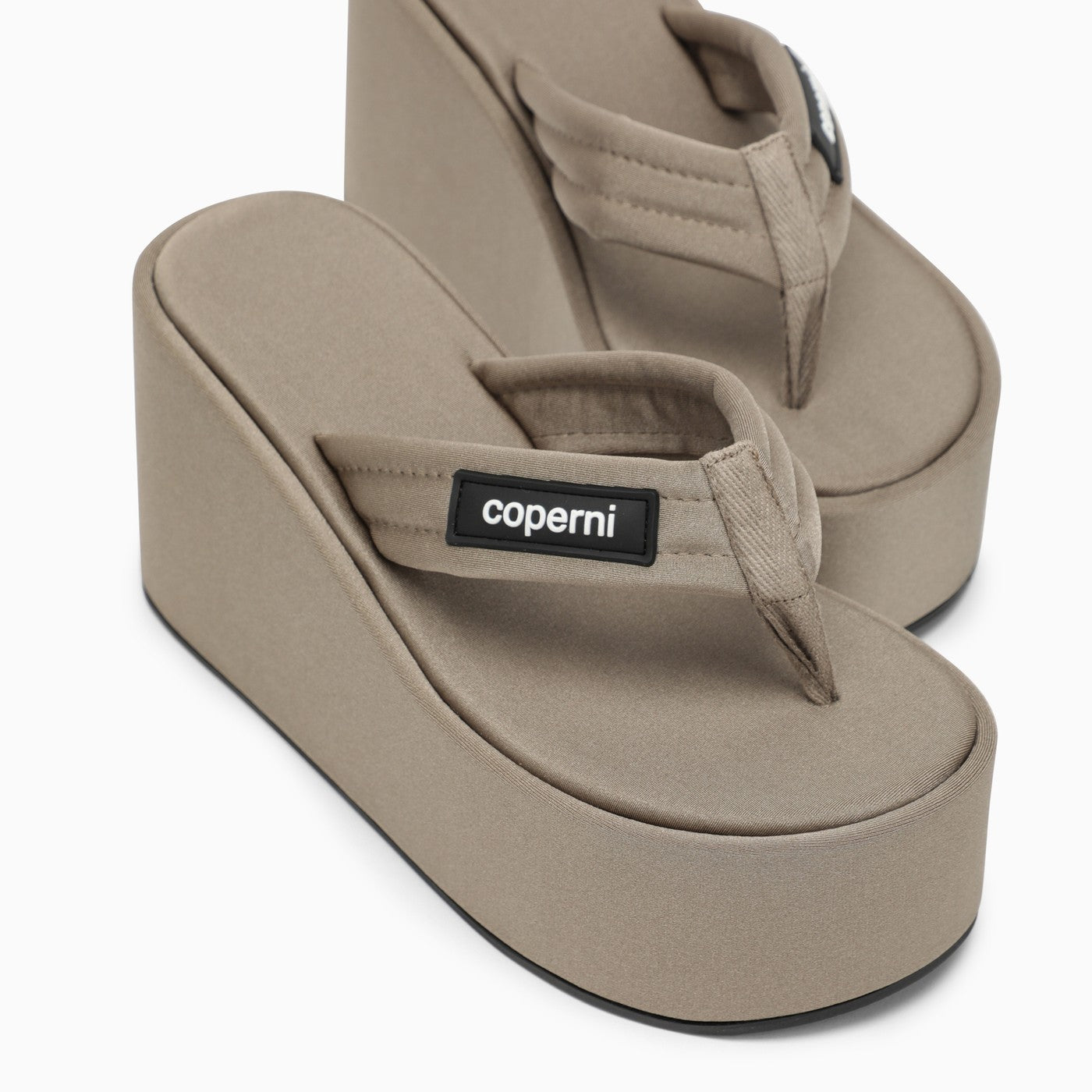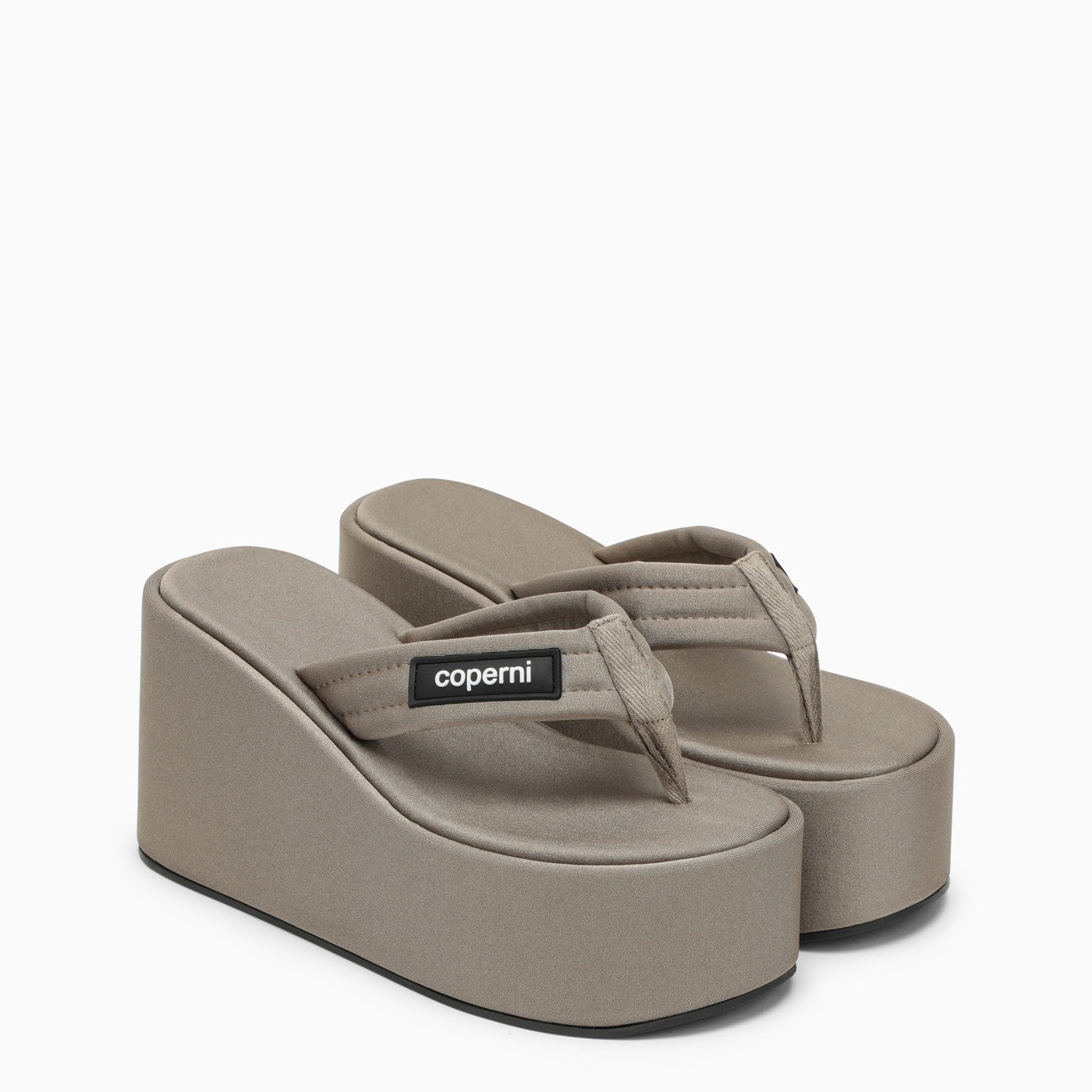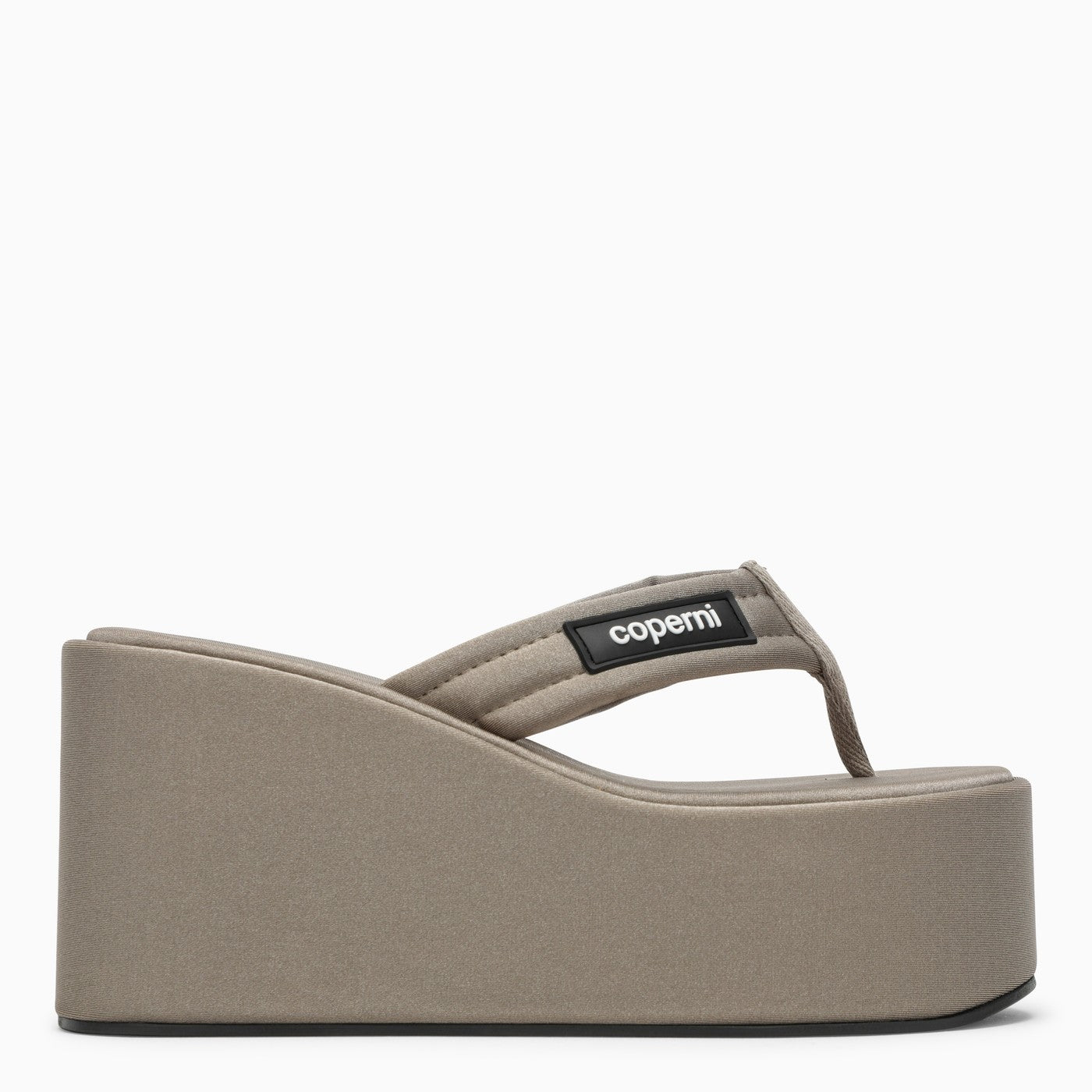 Sandalo Coperni grigio con design a flip-flop, targa logo, cuneo alto e suola in gomma.