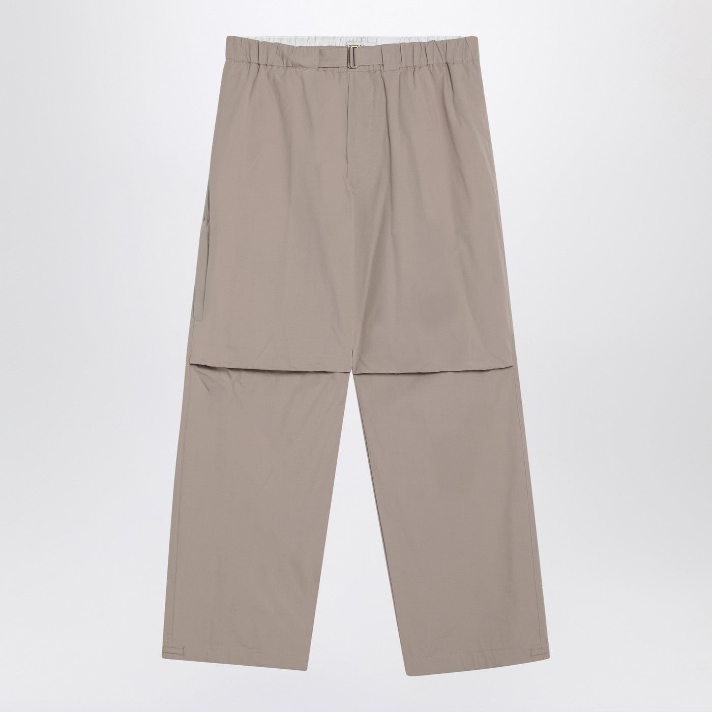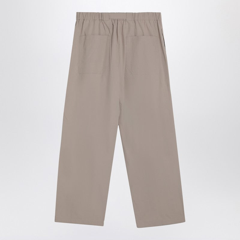 Ampi pantaloni scuri in cotone beige, caratterizzati da una vita a nastro regolabile, due tasche applicate sul retro e due tasche laterali.