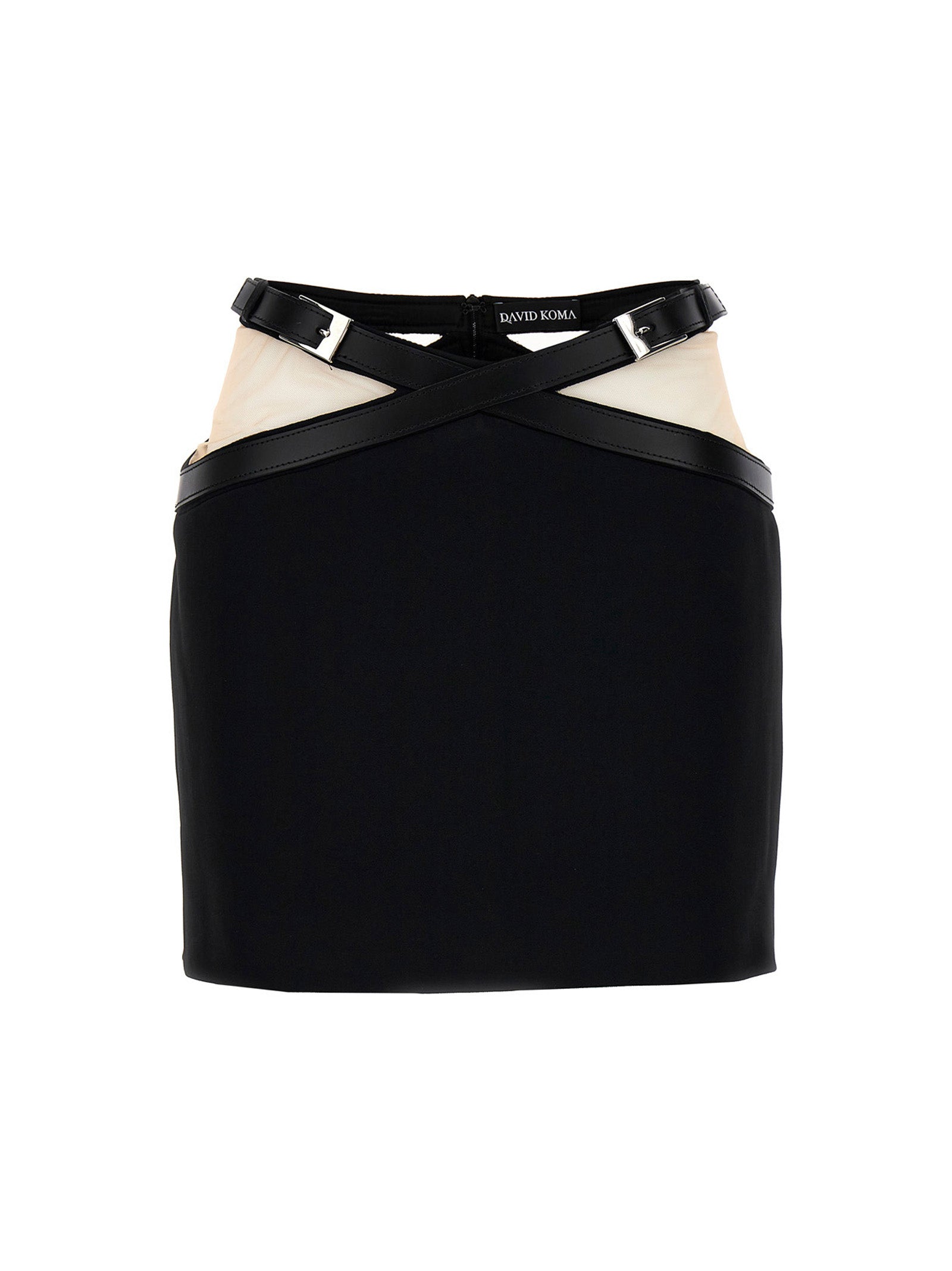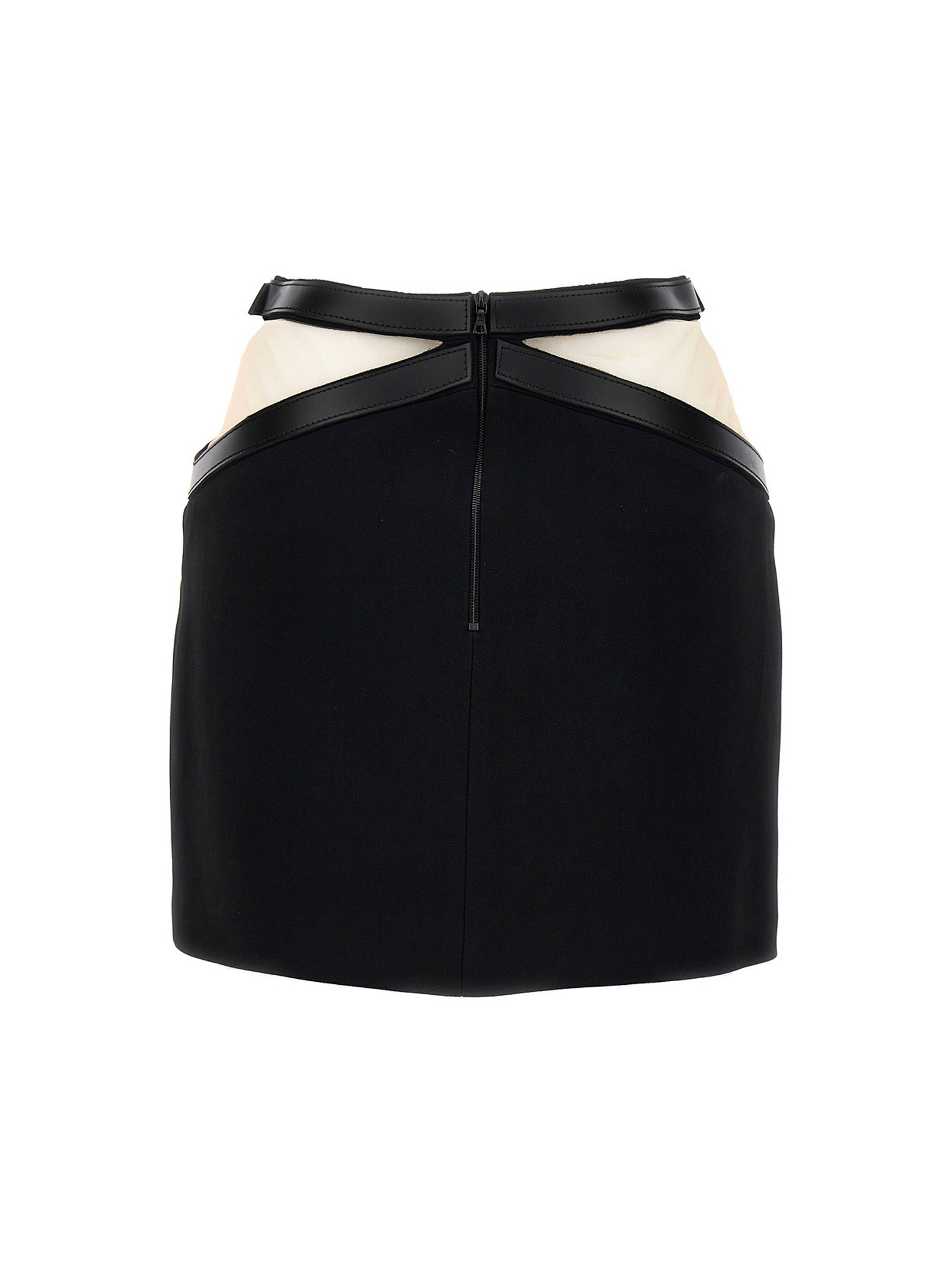 Gonna di miscela viscosa a tracolla a fascia a croce con dettagli in pelle, chiusura a zip e gancio posteriore, dettagli del tessuto a mesh a contrasto.
