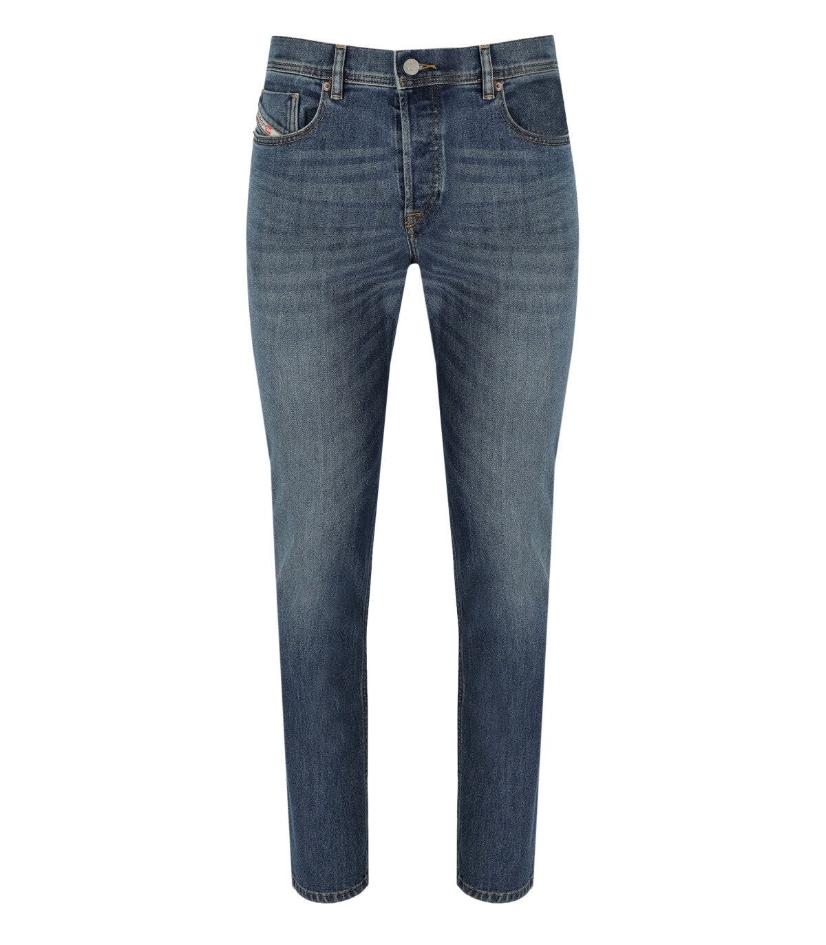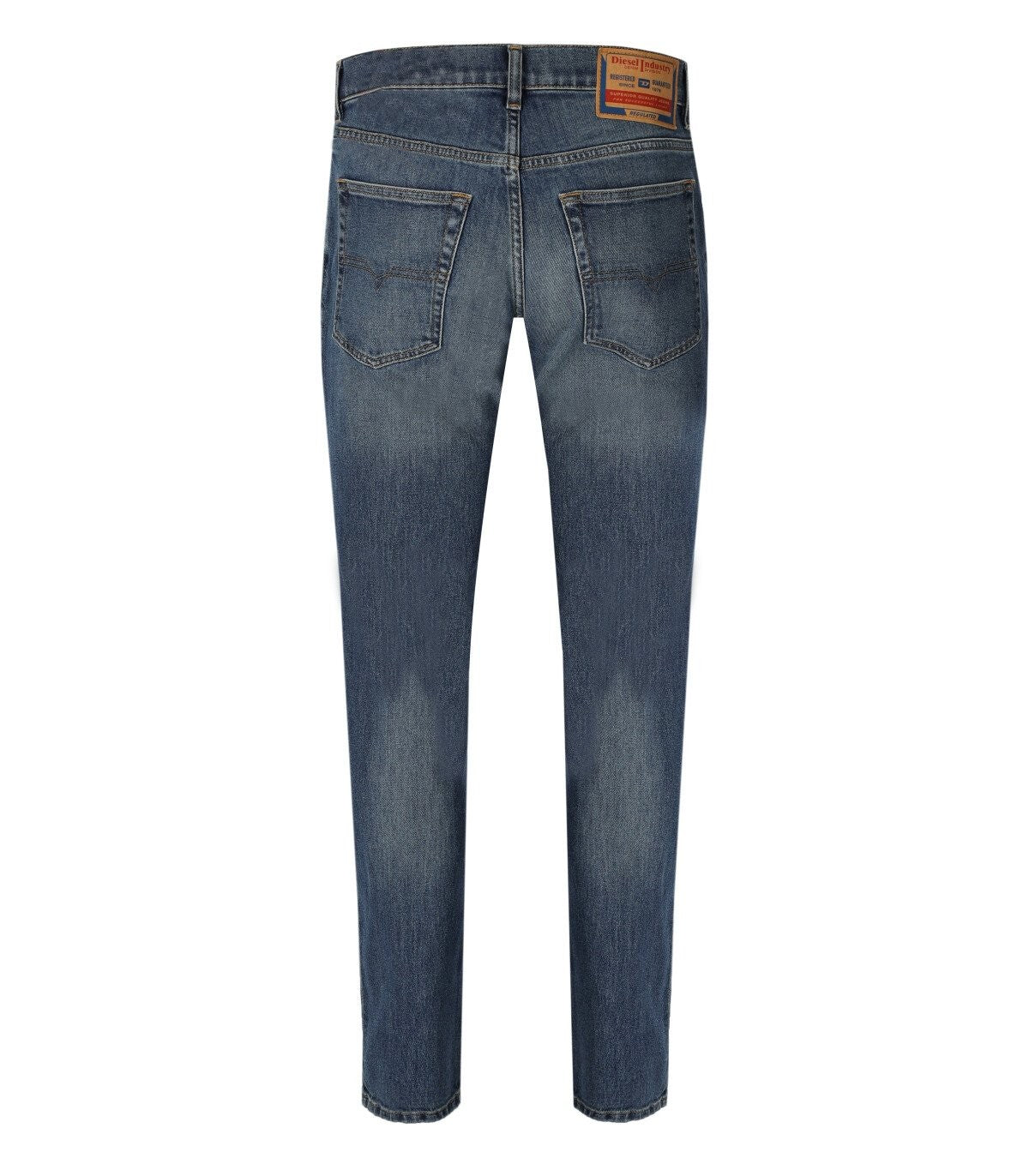 2023 jeans definiti a D di diesel realizzati in denim di cotone a effetto azzimato blu. Cinque design tascabile, chiusura dei pulsanti e piastra logo sul retro. Adattamento regolare, vita media e gamba affusolata. Lunghezza 32. Composizione: 94% di cotone, 5% poliestere, 1% di elastano.