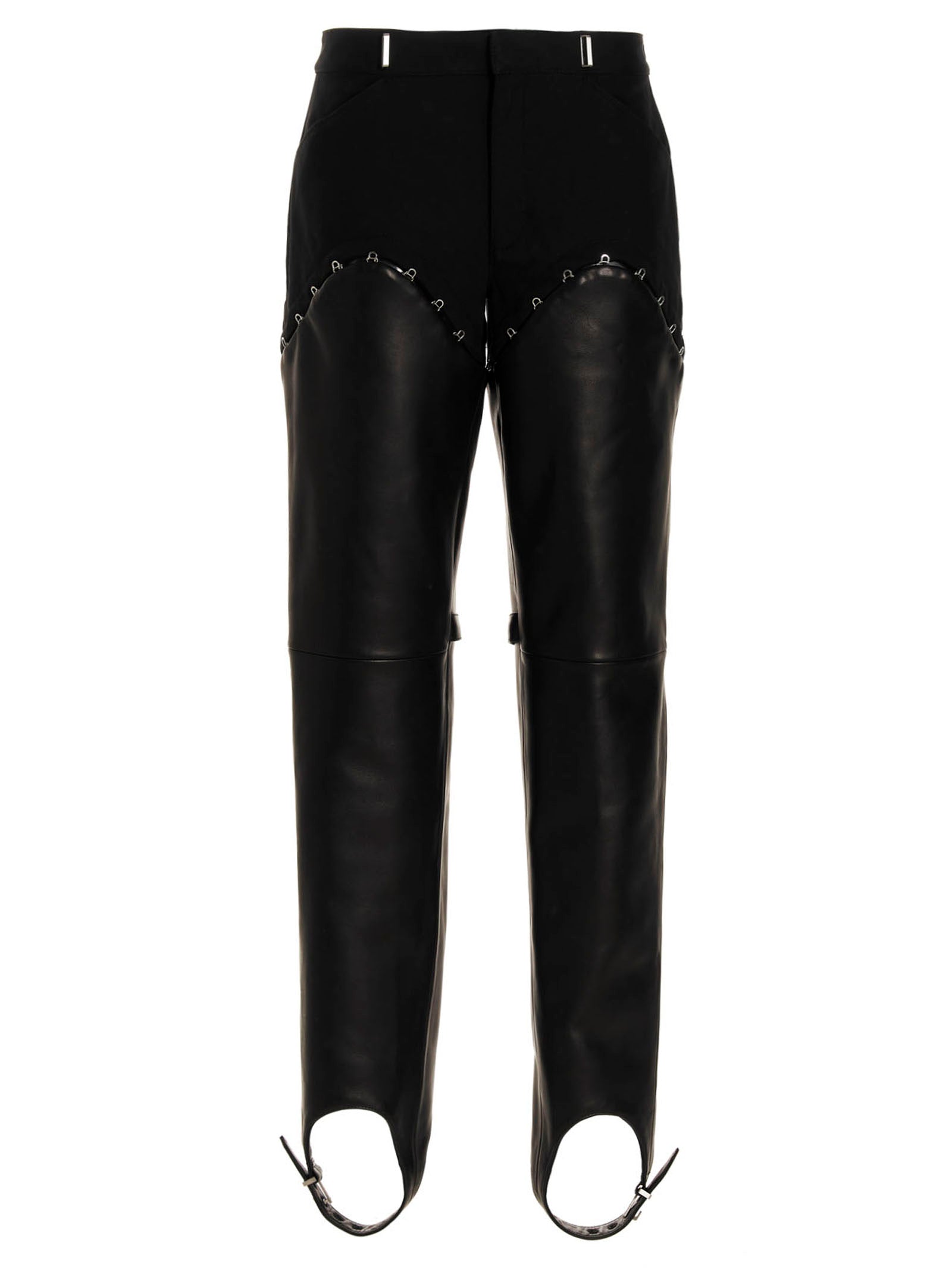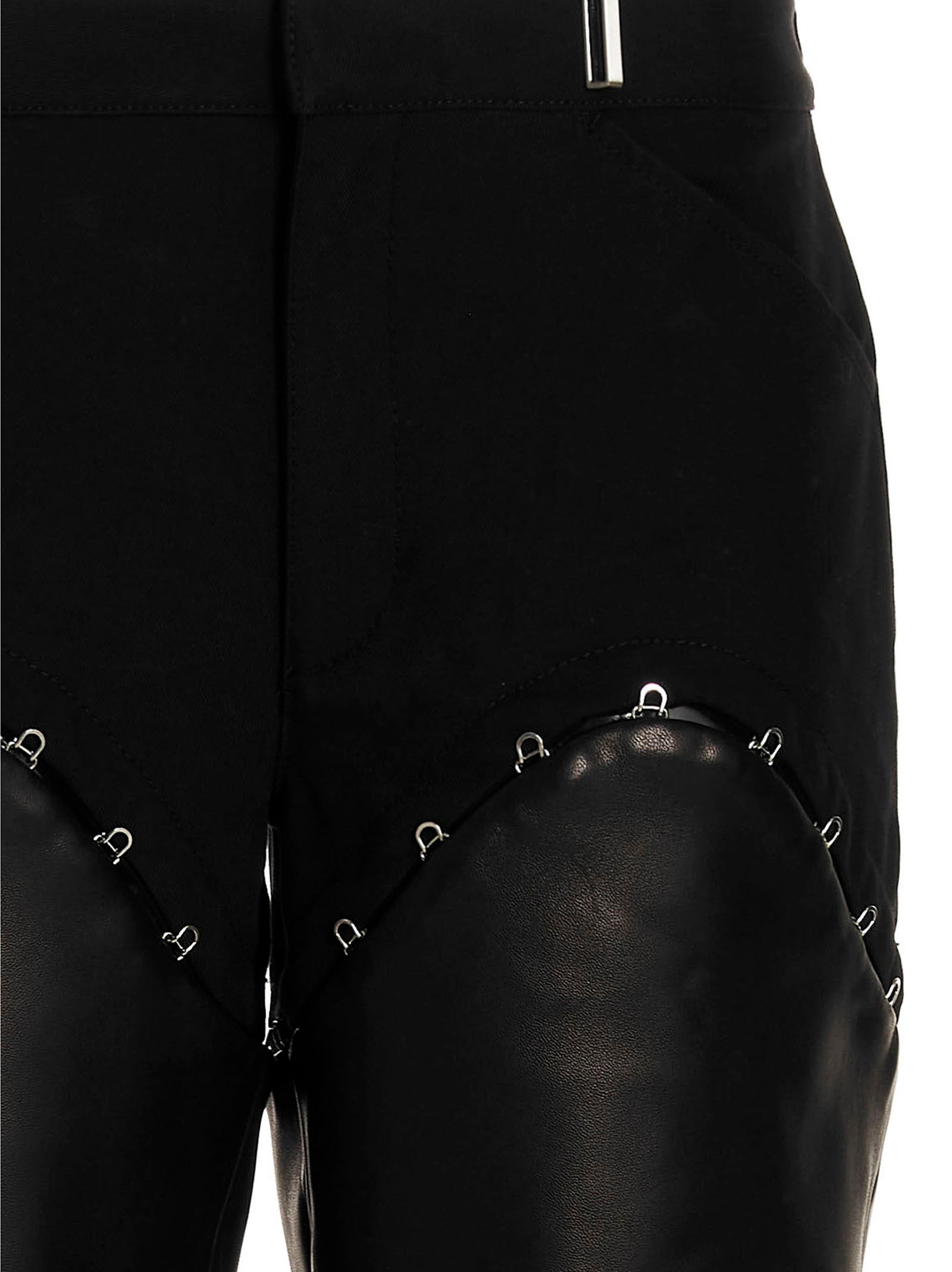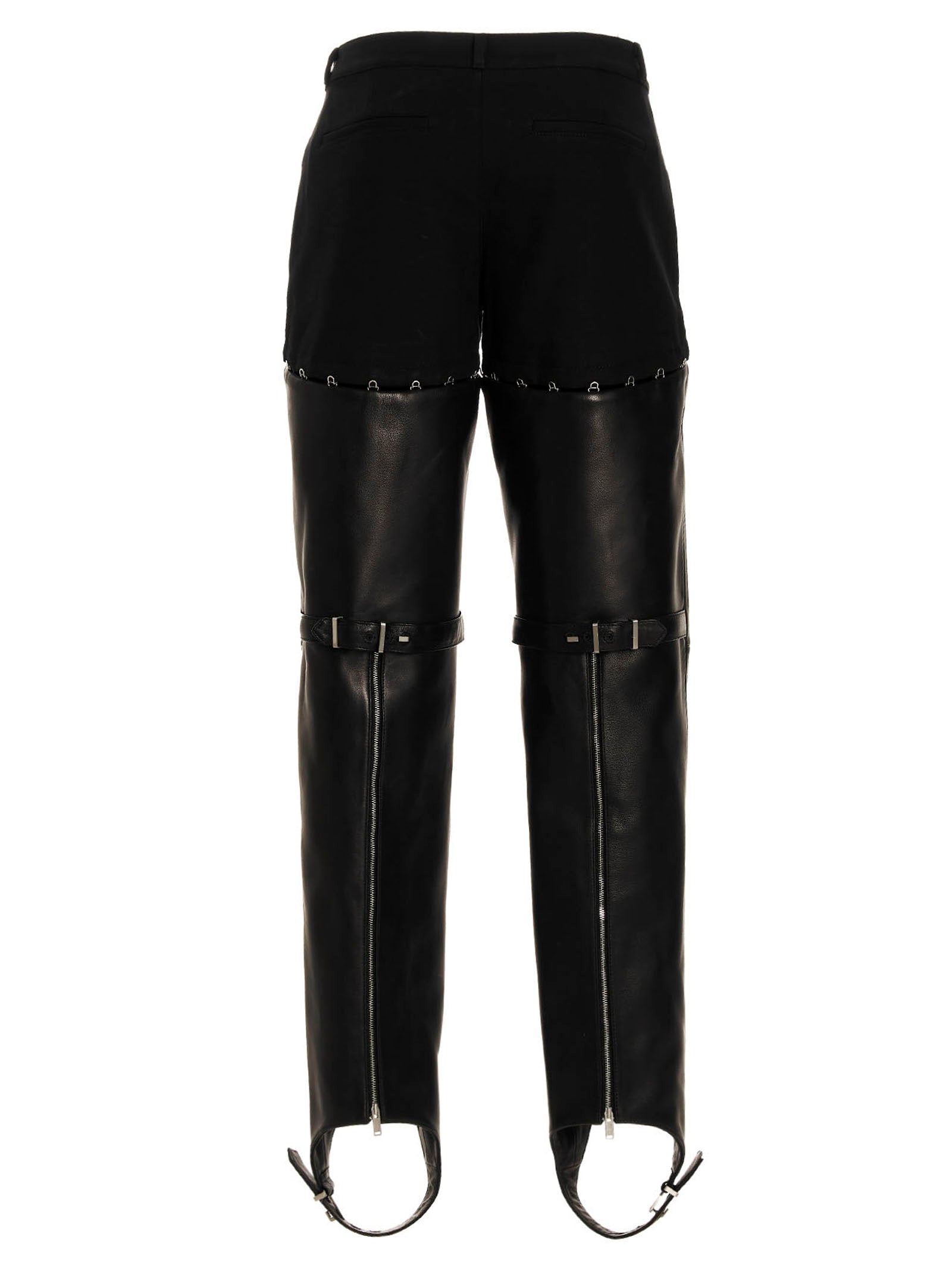 Pantaloni di cotone e pelle con fondo rimovibile a gancio e occhio, vita alta, gancio e occhio e fissaggio a bottone.