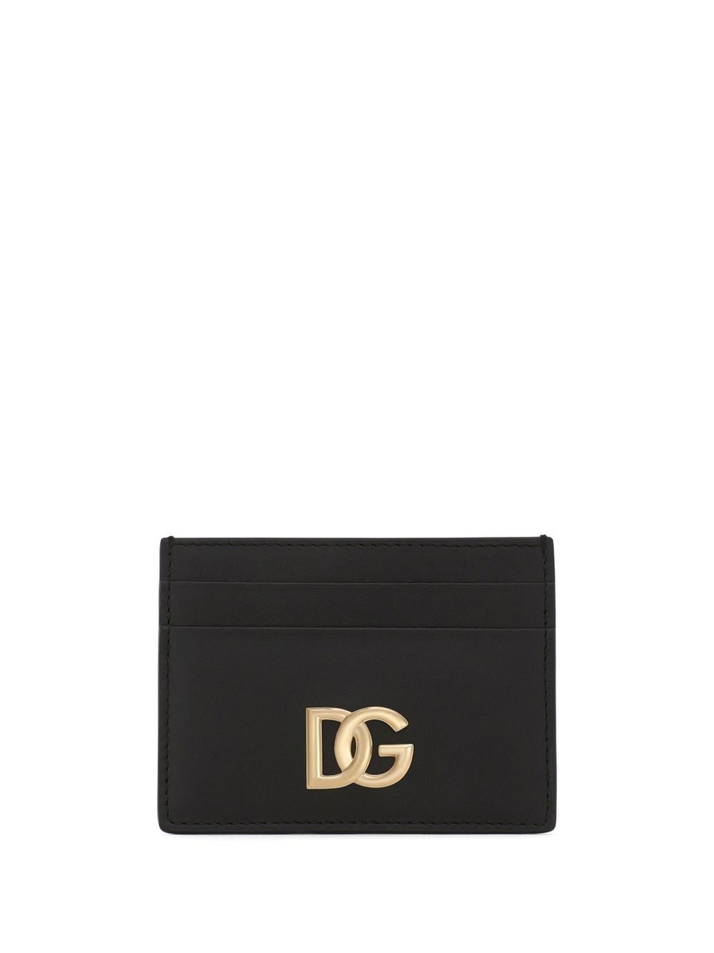 Placca di logo nero, pelle di vitello, tono d'oro, slot di carta e design rettangolare.