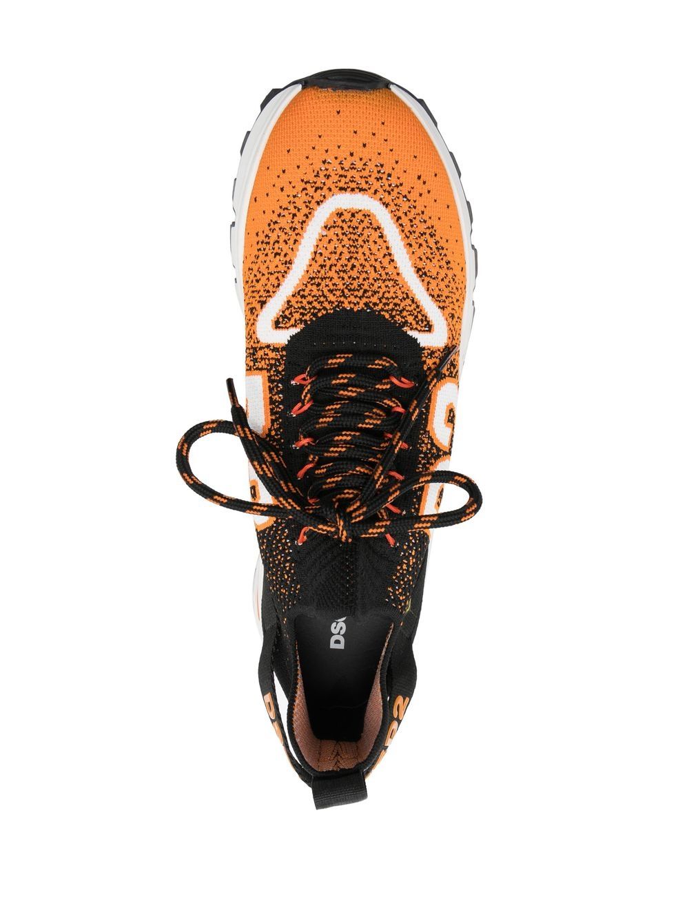 DSQ2 Knit-Upper Sneakers di Dsquared2 con nero, arancione bruciato, tomaia a maglia, stampa a foglie d'acero, dettagli logo-tape, punta rotonda, fissaggio a pizzo anteriore, lingua a raggruppata logo, pull-tab sul tallone e suola in gomma increspata.