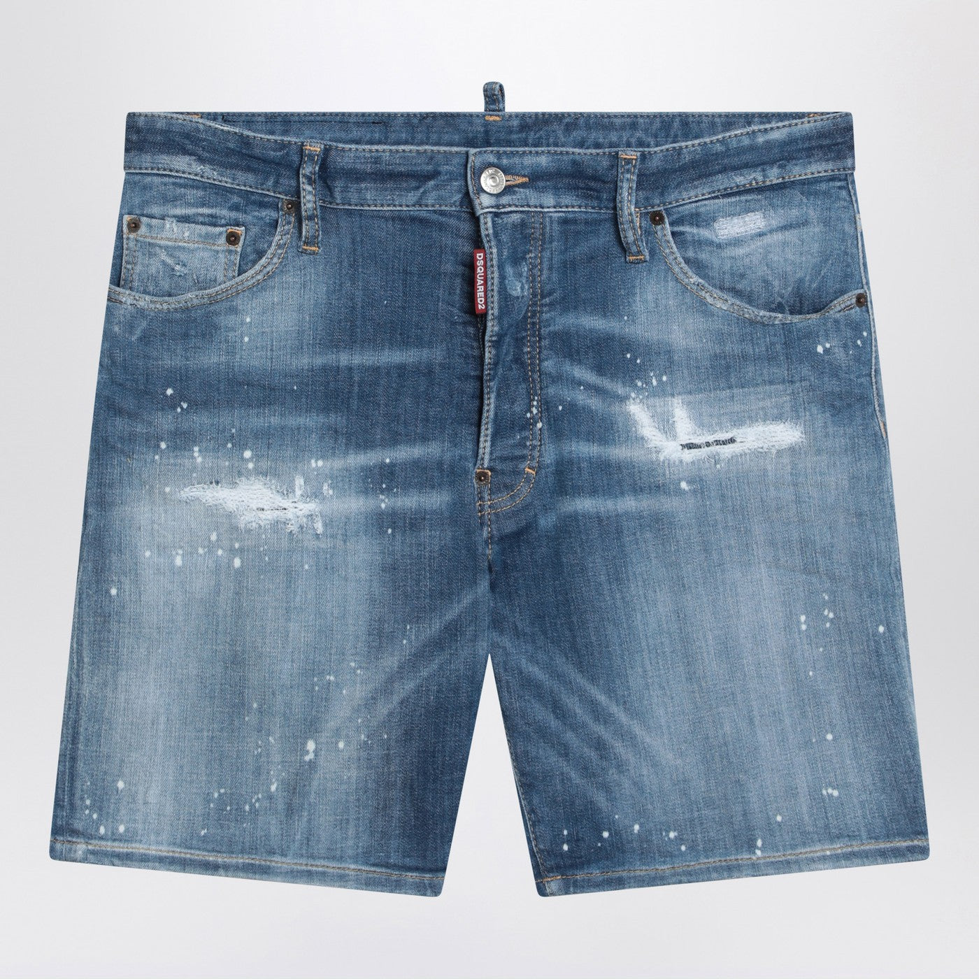 Shorts bermuda in denim di cotone lavati blu da DSQuered2 con una cerniera anteriore e un fissaggio a bottone, una targa logo di lettere, anelli della cintura, un classico design a cinque tasca, abbigliamento localizzato e macchie e una patch logo sul retro.