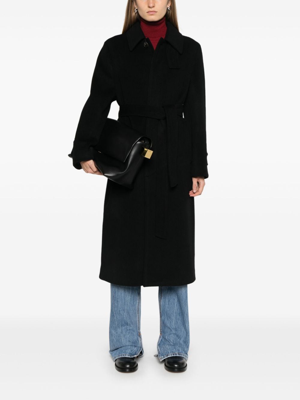 black wool concealed front button fastening spread collar long sleeves buttoned cuffs detachable belt two side welt pockets central rear vent full lining straight hem When buying this unisex item, keep in mind that it is graded in standard men's sizing.