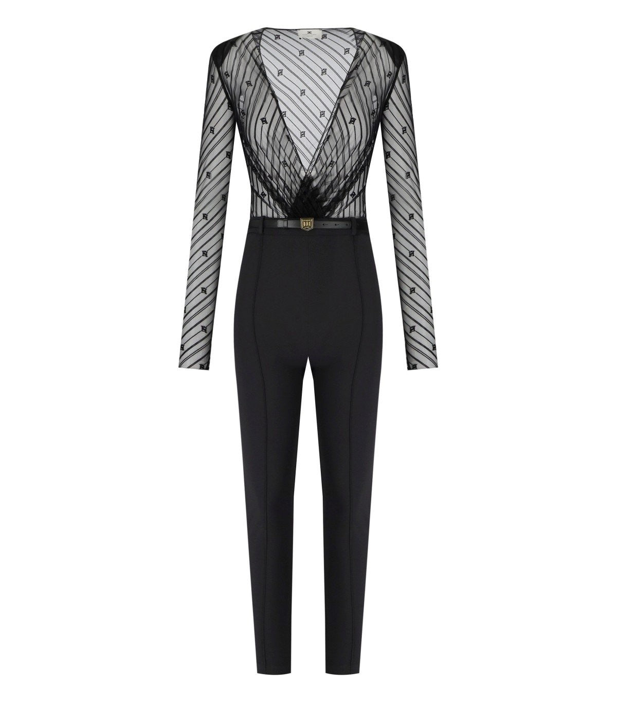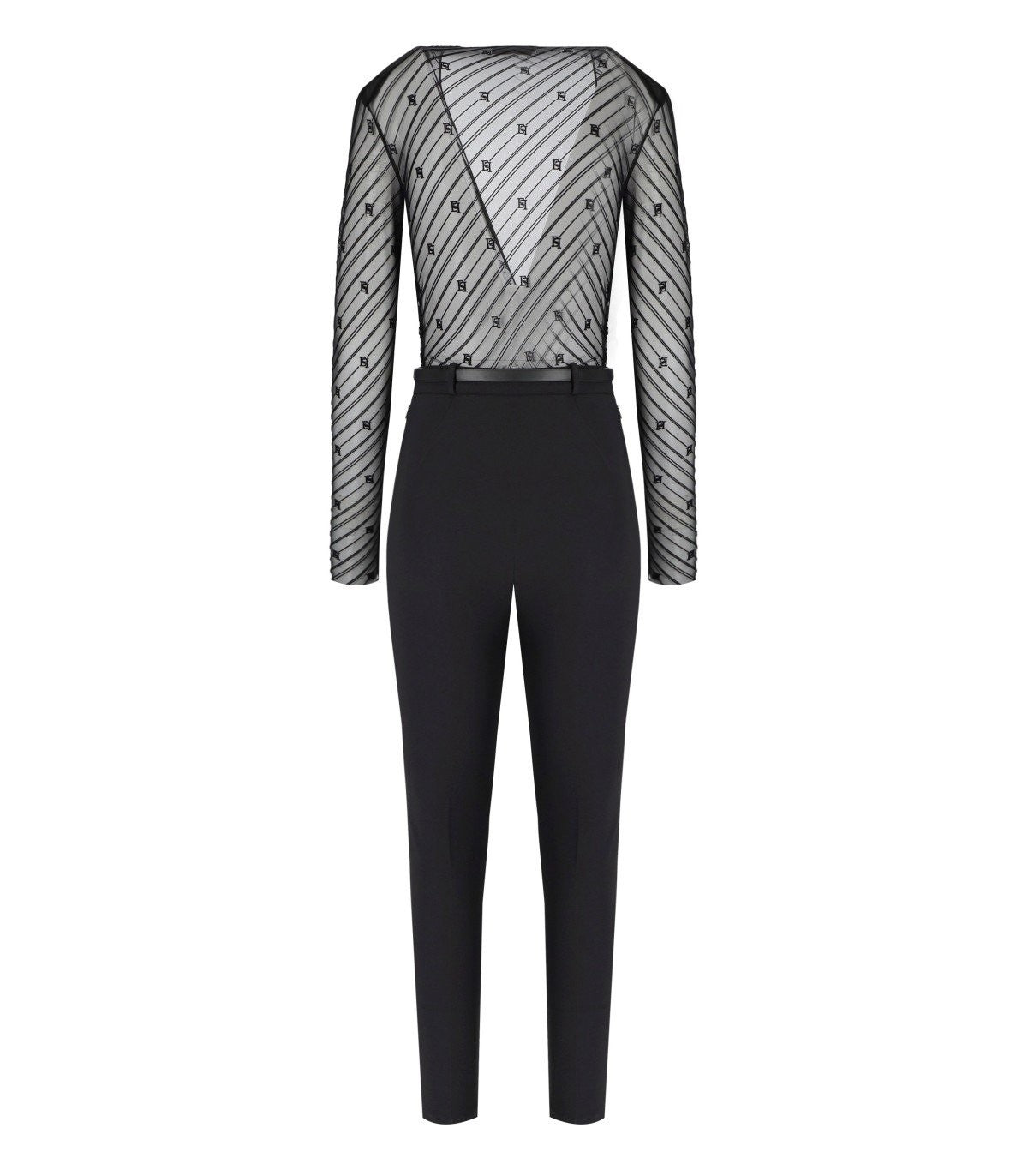 La tuta di Elisabetta Franchi fatta di tulle di gregge nero rifinita con un elegante design diagonale. Caratterizzato da una parte superiore staccabile, presenta maniche lunghe e una scollatura crossover profonda nella parte anteriore. La vita ha una cerniera invisibile sul lato enfatizzato da una cintura rimovibile con una fibbia con logo in metallo oro. Pantaloni dritti in stretch crêpe. Slimt fit. Composizione: 96% poliestere, 4% di elastano.
