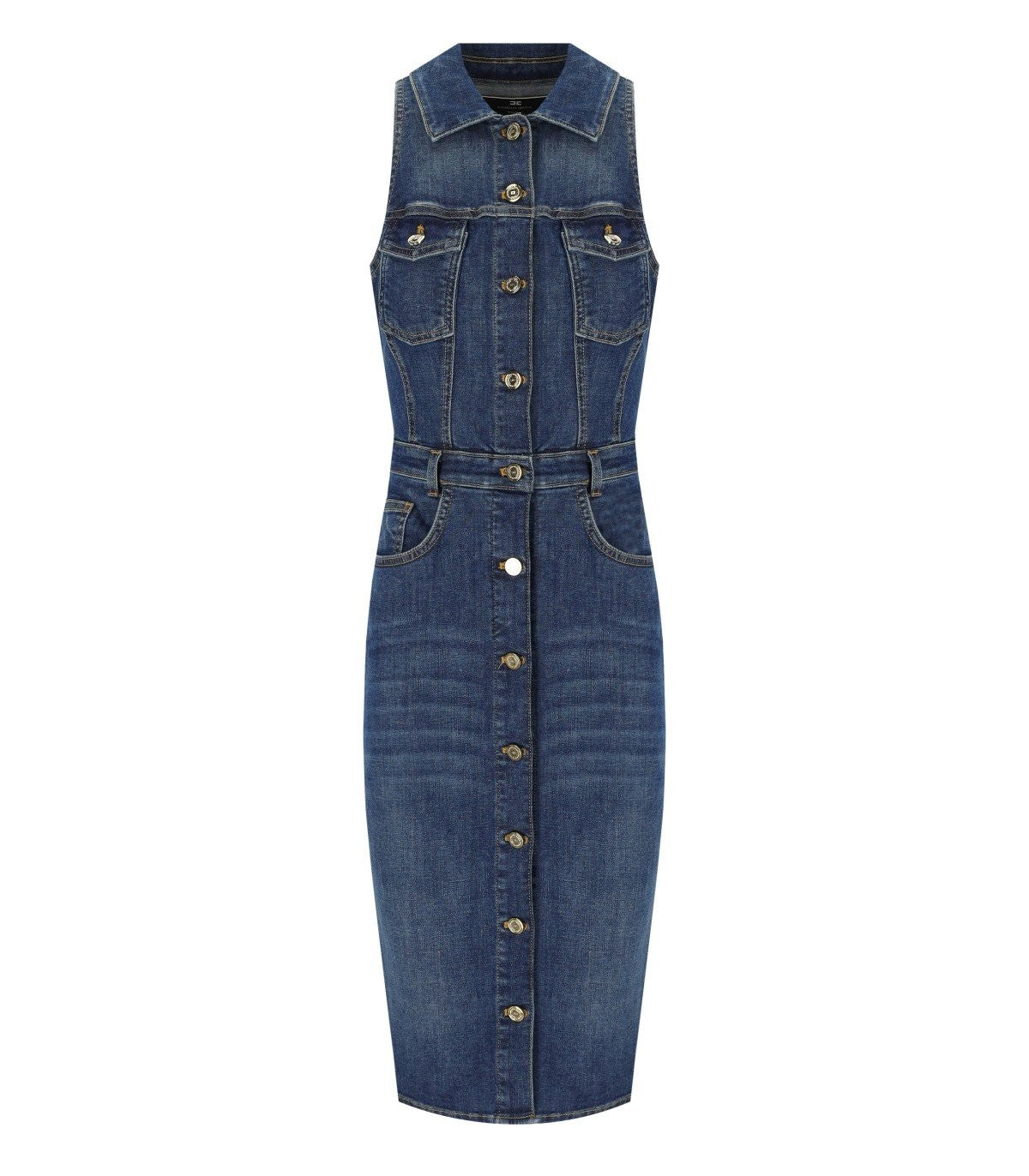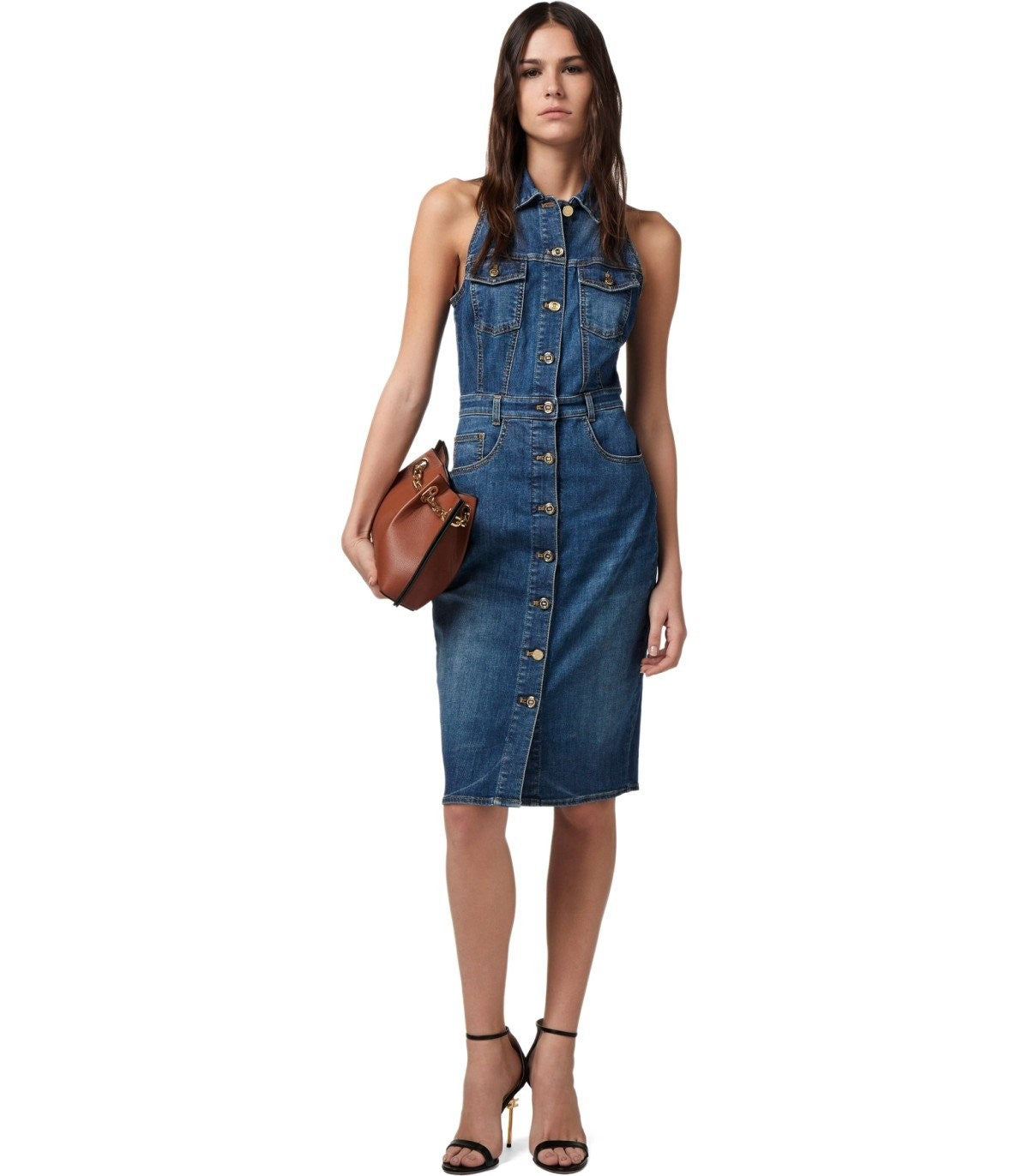 Elisabetta Franchi 's Abito fatto di denim elasticizzato a medio lavaggio. Collo di camicia, tasche a flap sul petto e logo ricamato sul retro. Cinture, chiusura dei pulsanti con pulsanti di marca. Slimt fit. Il modello è alto 177 cm e indossa una taglia 40it. Composizione: 98% di cotone, 2% elastano.