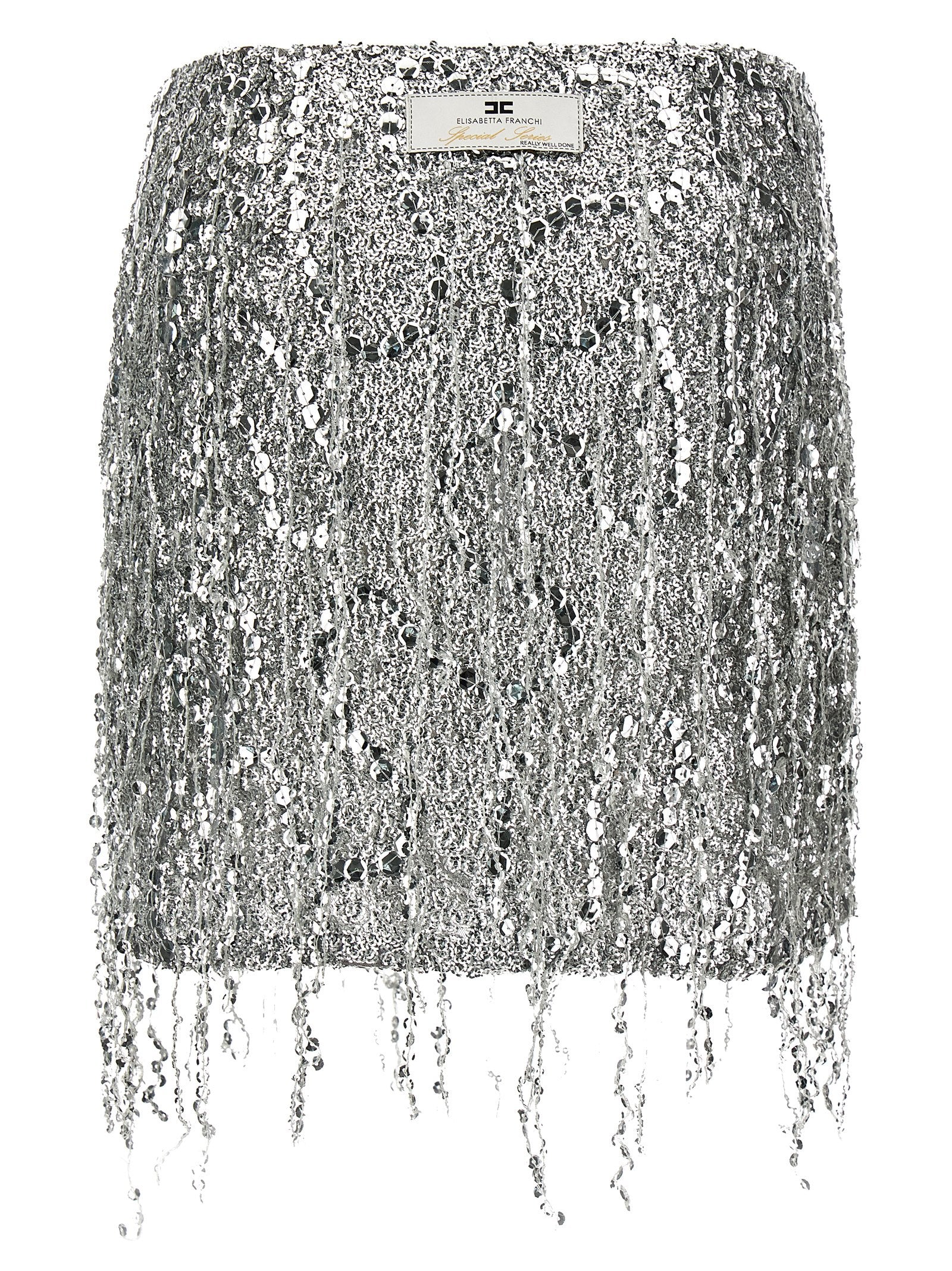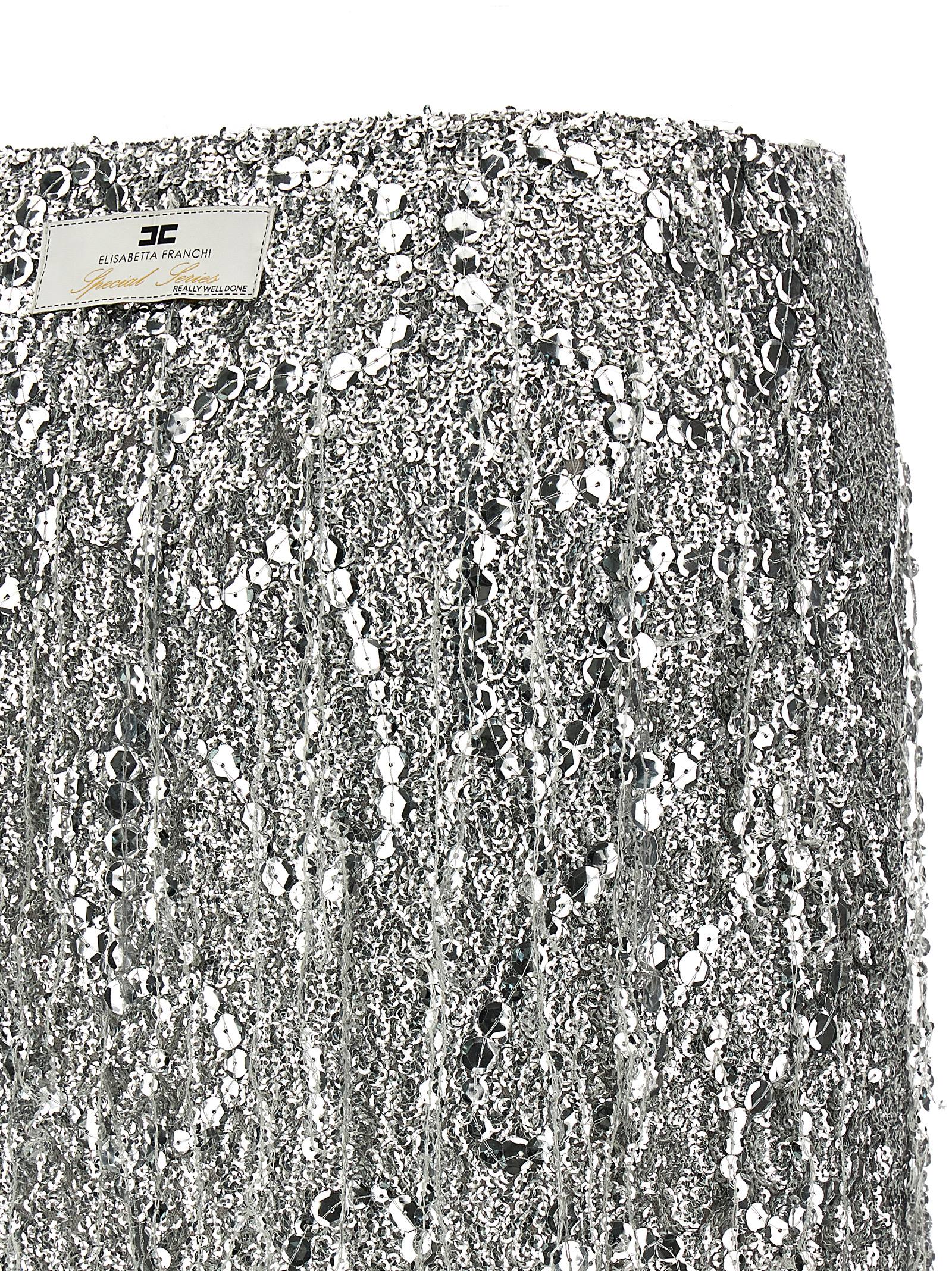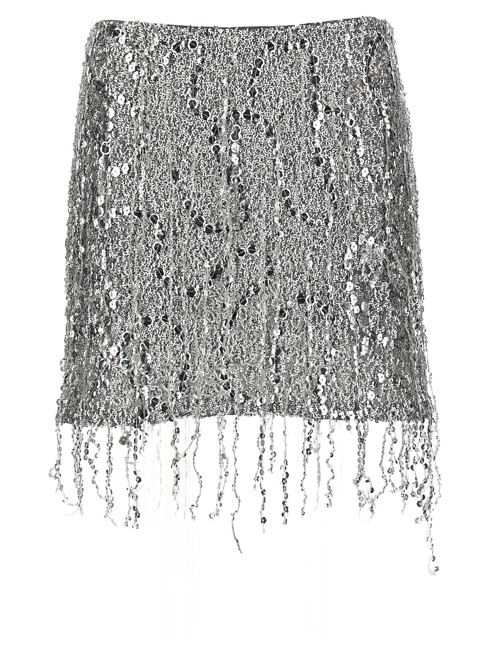 Gonna di tulle con paillettes all-over, frange sull'orlo, chiusura a zip laterale.