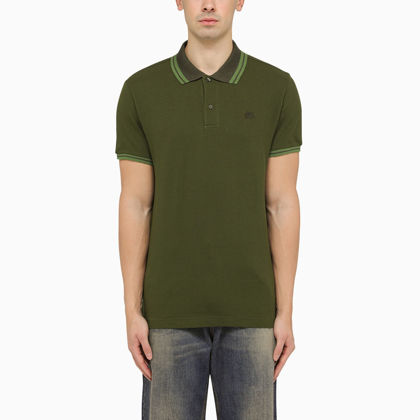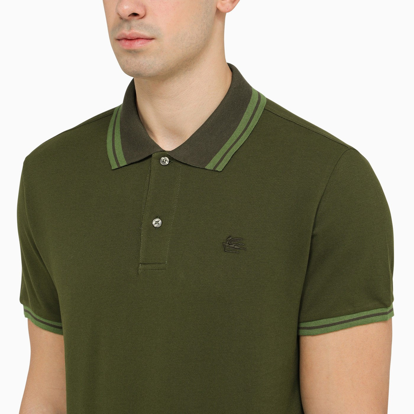 Polia a maniche corte di Etro in cotone verde, con un ricamo logo sul petto, un classico colletto abbottonato, bordi a strisce contrastanti e vestibilità regolare.