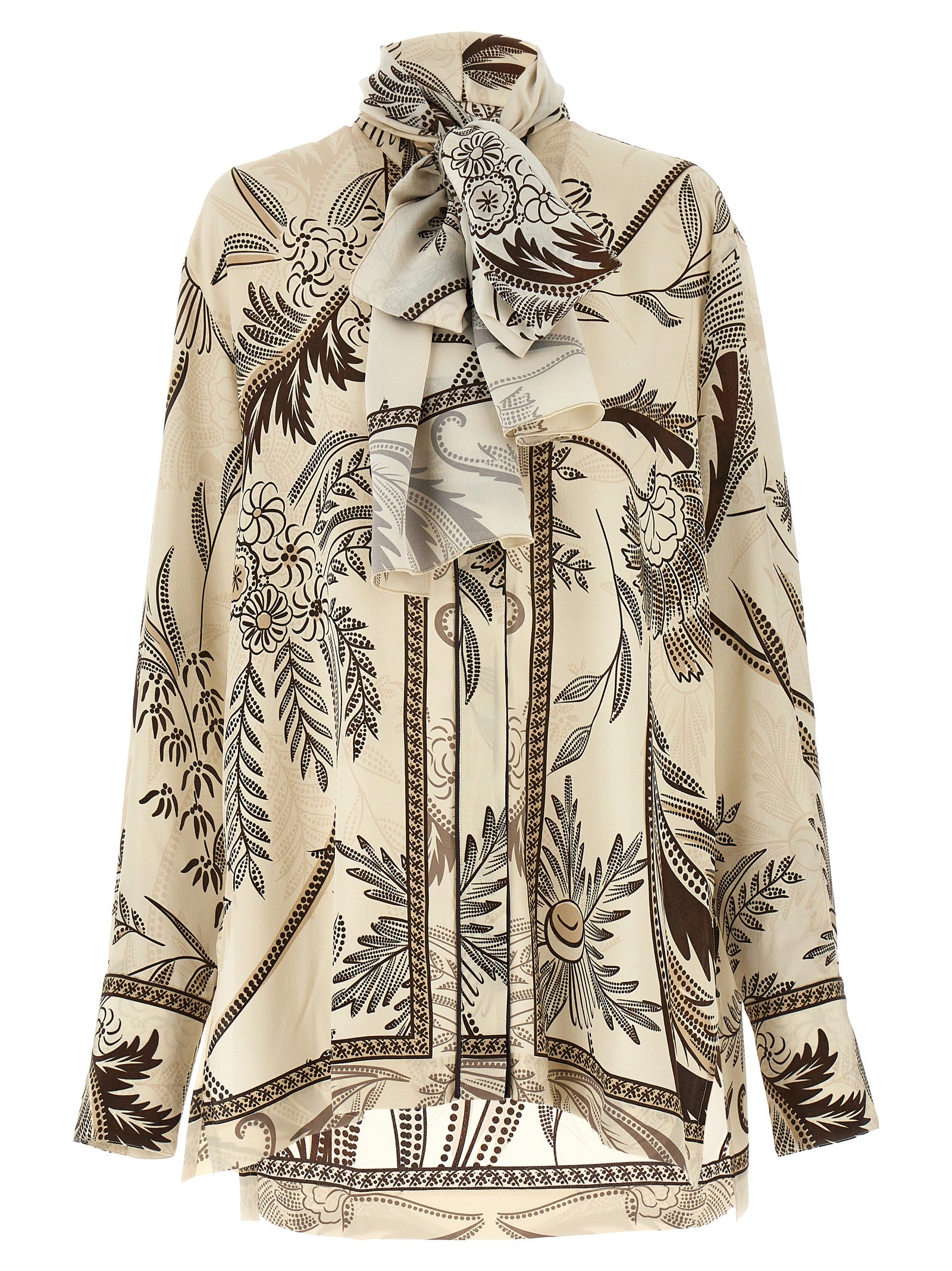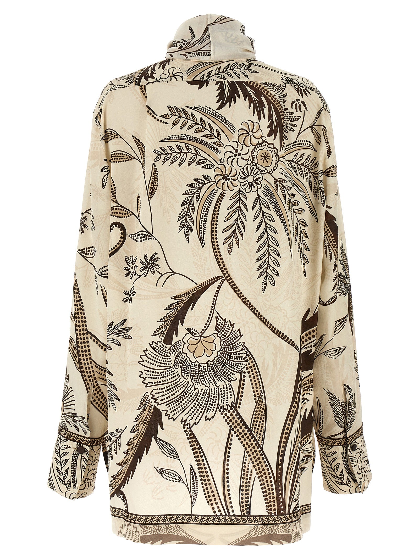 Camicia di seta stampata da "Egle" con cravatta a ghigliottica al collo rimovibile, maniche confuse lunghe, chiusura dei bottoni.