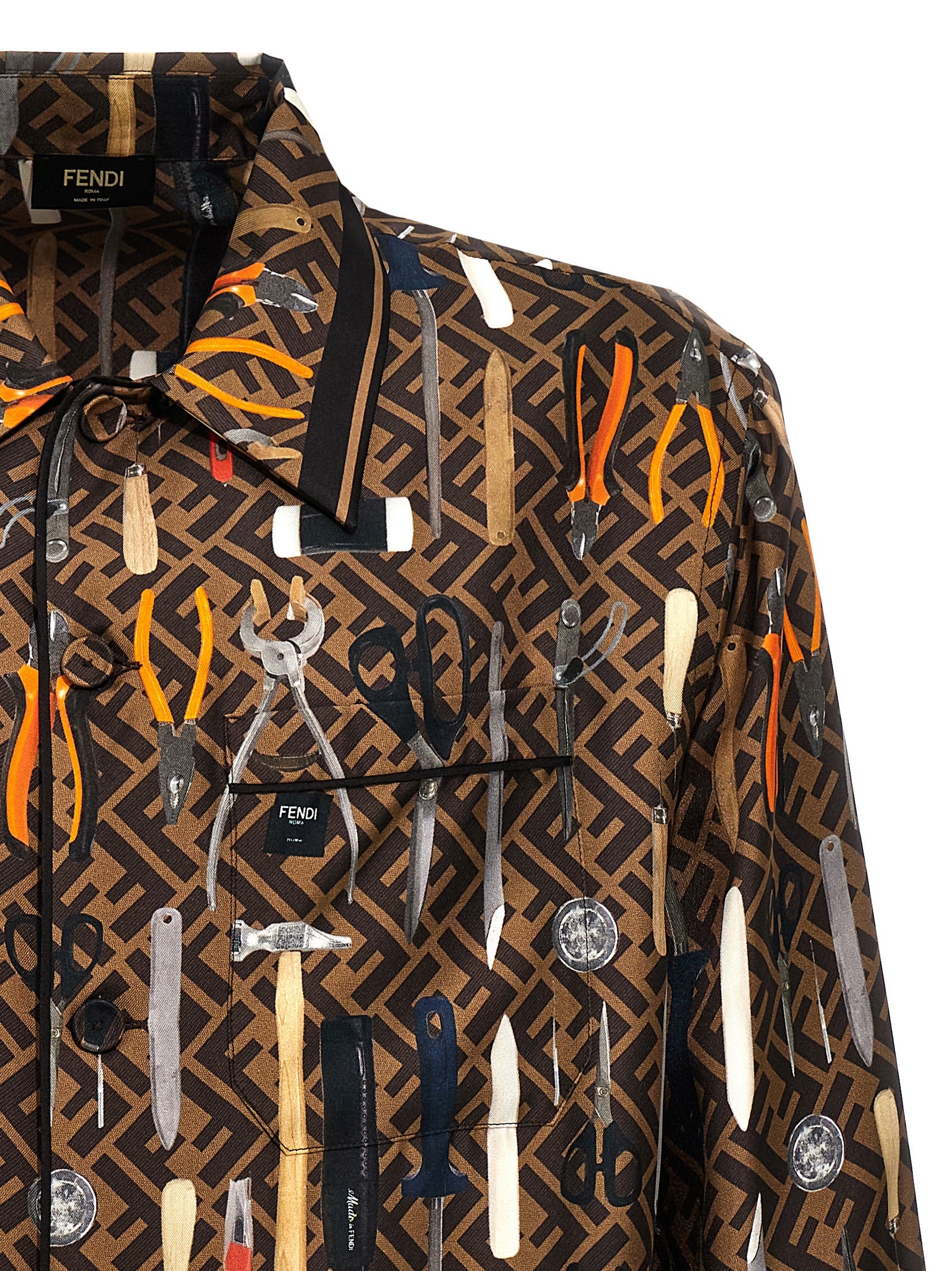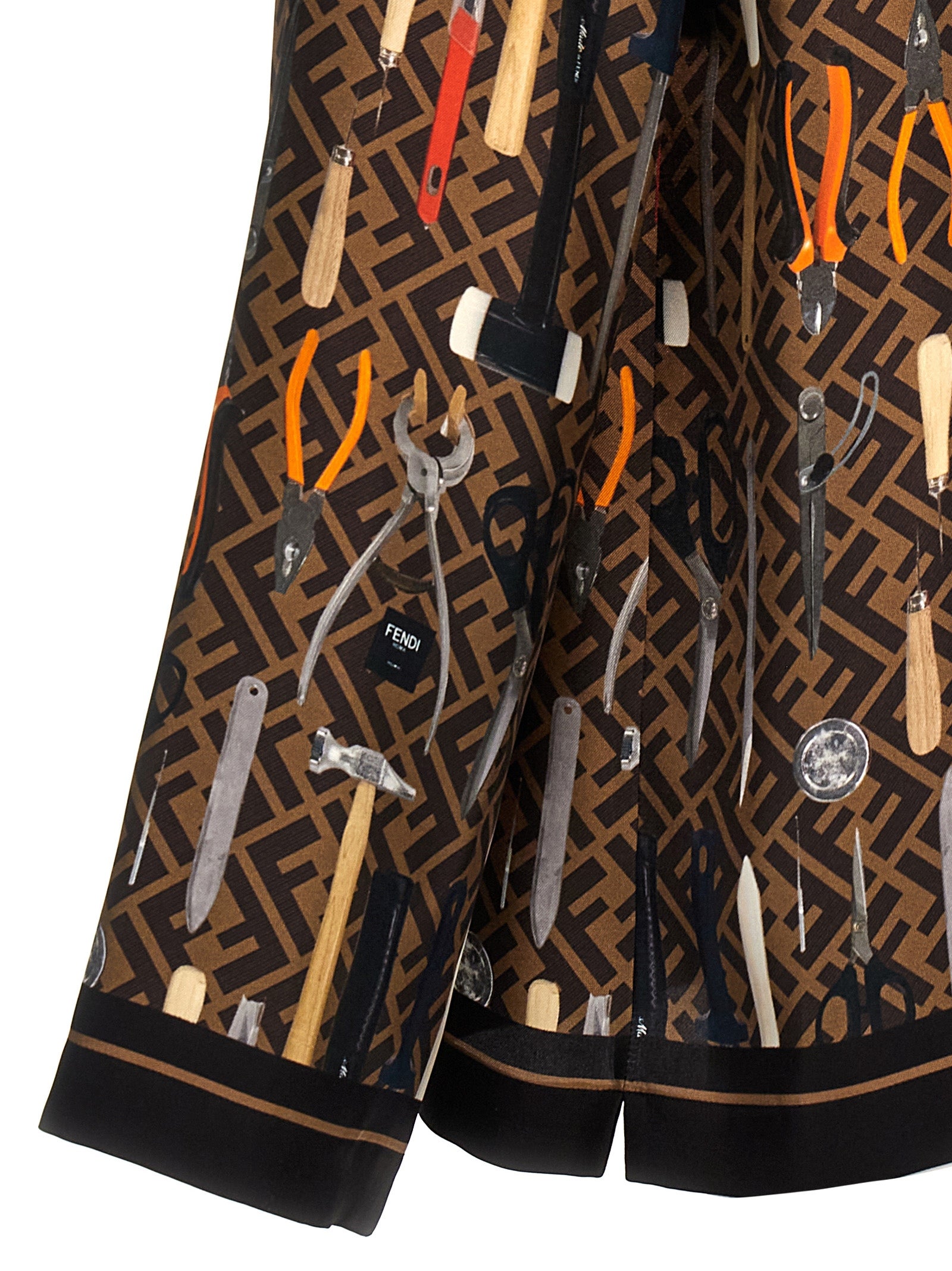 Camicia di seta "Fendi Tools" con una linea fluida con strumenti di stampa all-over e FF, chiusura dei pulsanti.