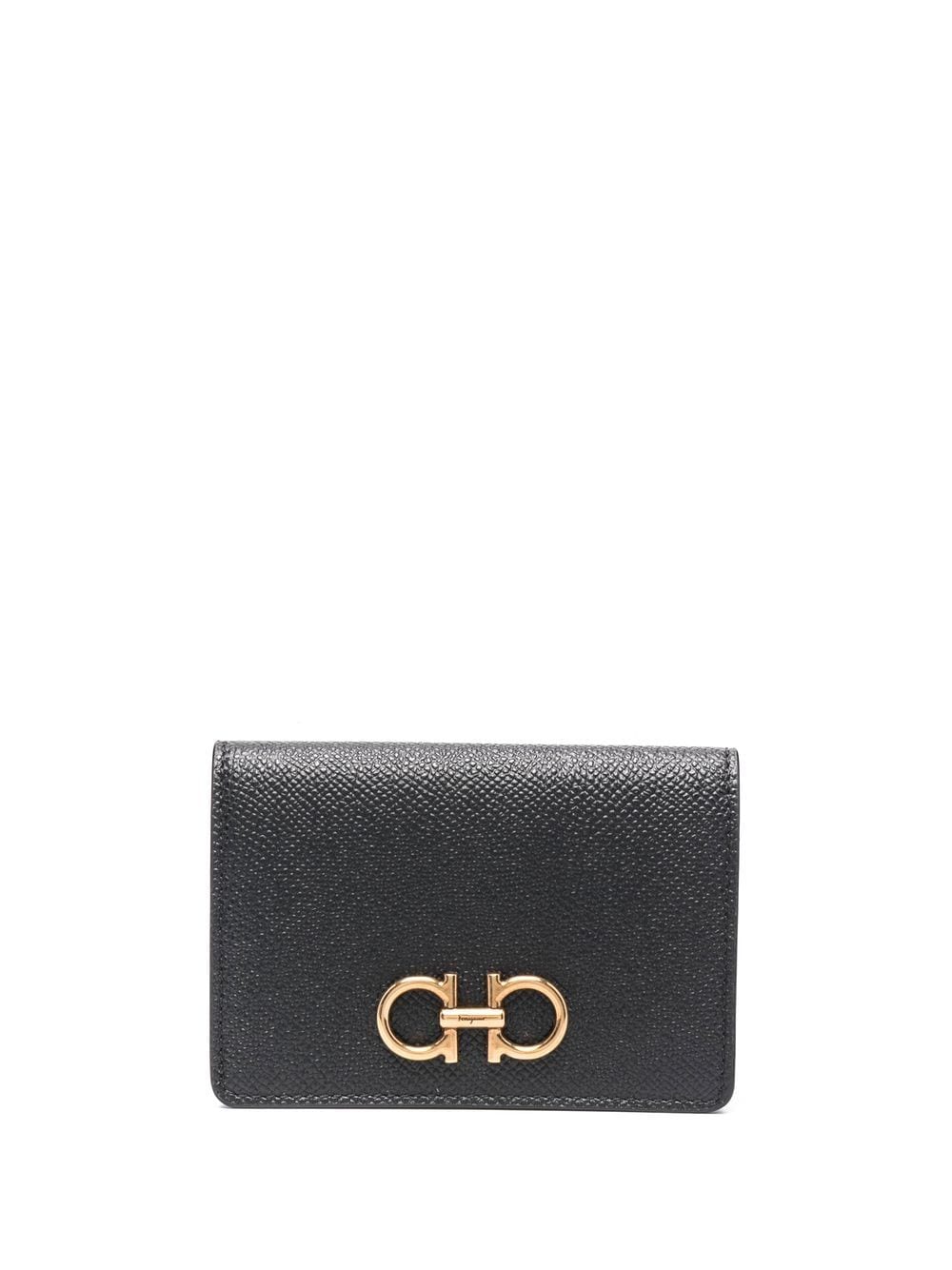 Portafoglio logo-placo di Salvatore Ferragamo con la placca logo tono in oro, chiusura a patta anteriore, scompartimento principale, nero/oro e pelle.