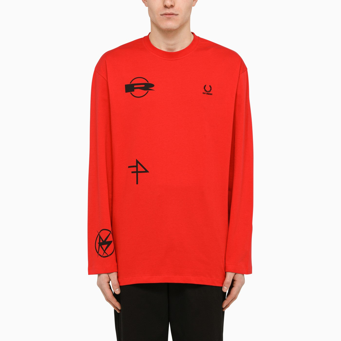 T-shirt di Fred Perry X Raf Simons in cotone rosso, con equipaggiatura, maniche lunghe, ricamo a logo sul petto, stampe a contrasto all-over e un fascino sul retro.