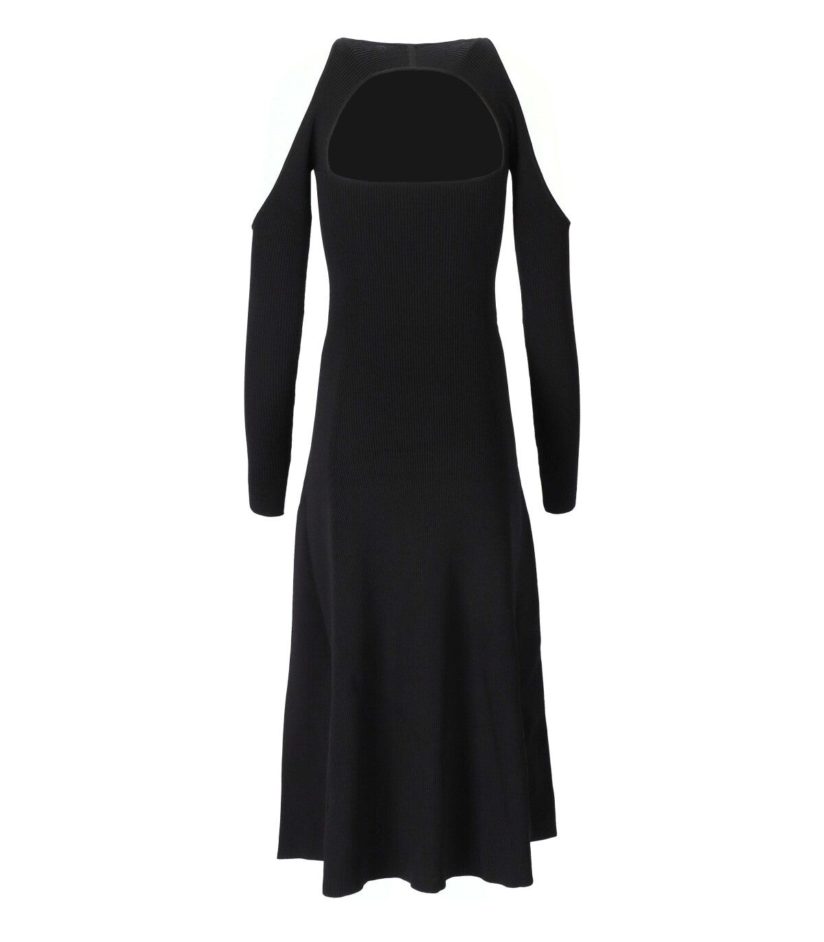 Abito Ganni fatto di miscela di rayon a coste nere, con dettagli aperti e ritagliati sulle spalle. Piccole fessure sui polsini. Il modello è alto 180 cm e indossa dimensioni S. Composizione: 55% rayon, 29% poliammide, 16% elastano.