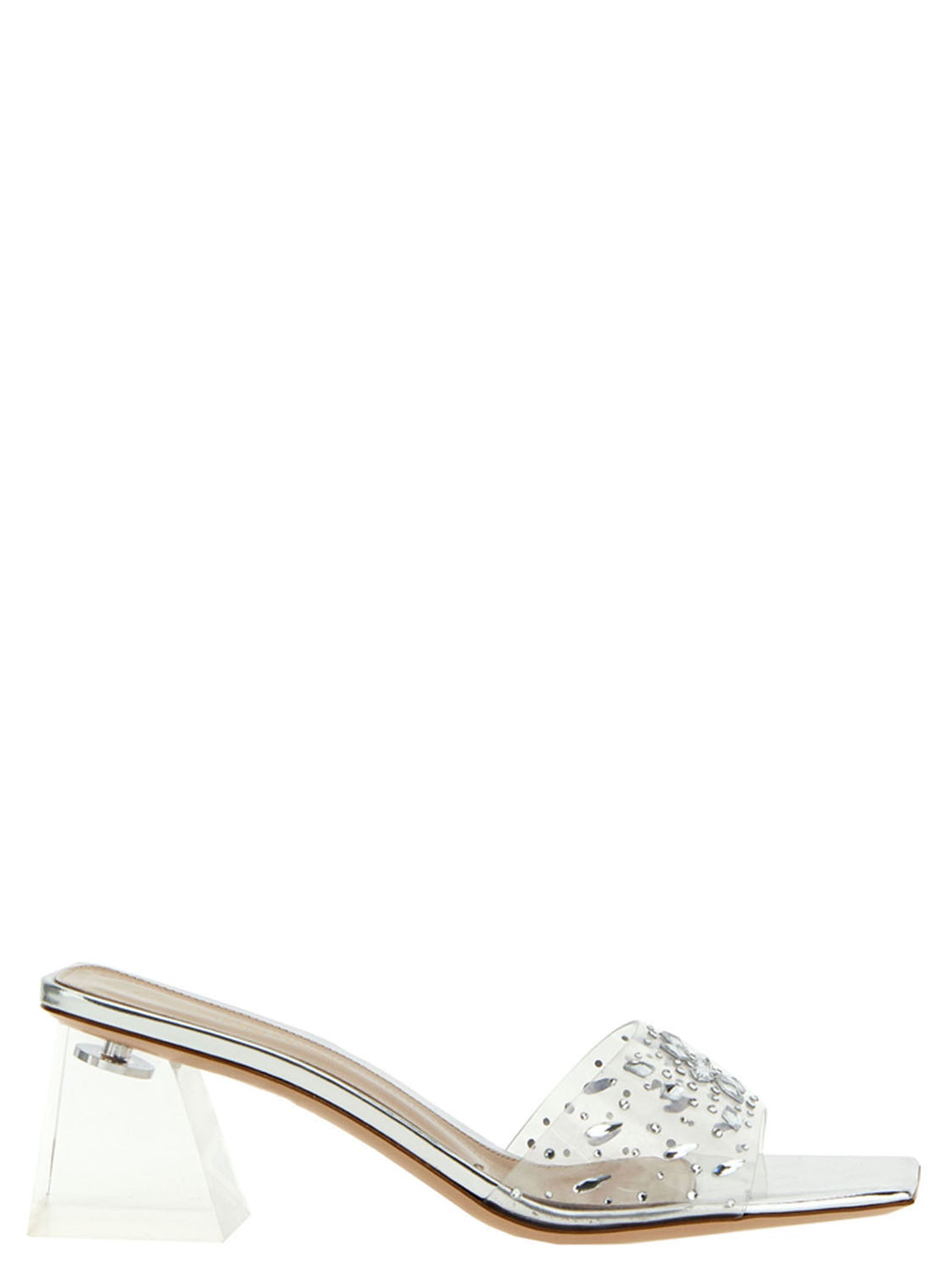 Sandali in pelle laminato e PVC con appliqué di strass e tallone scolpito trasparente.