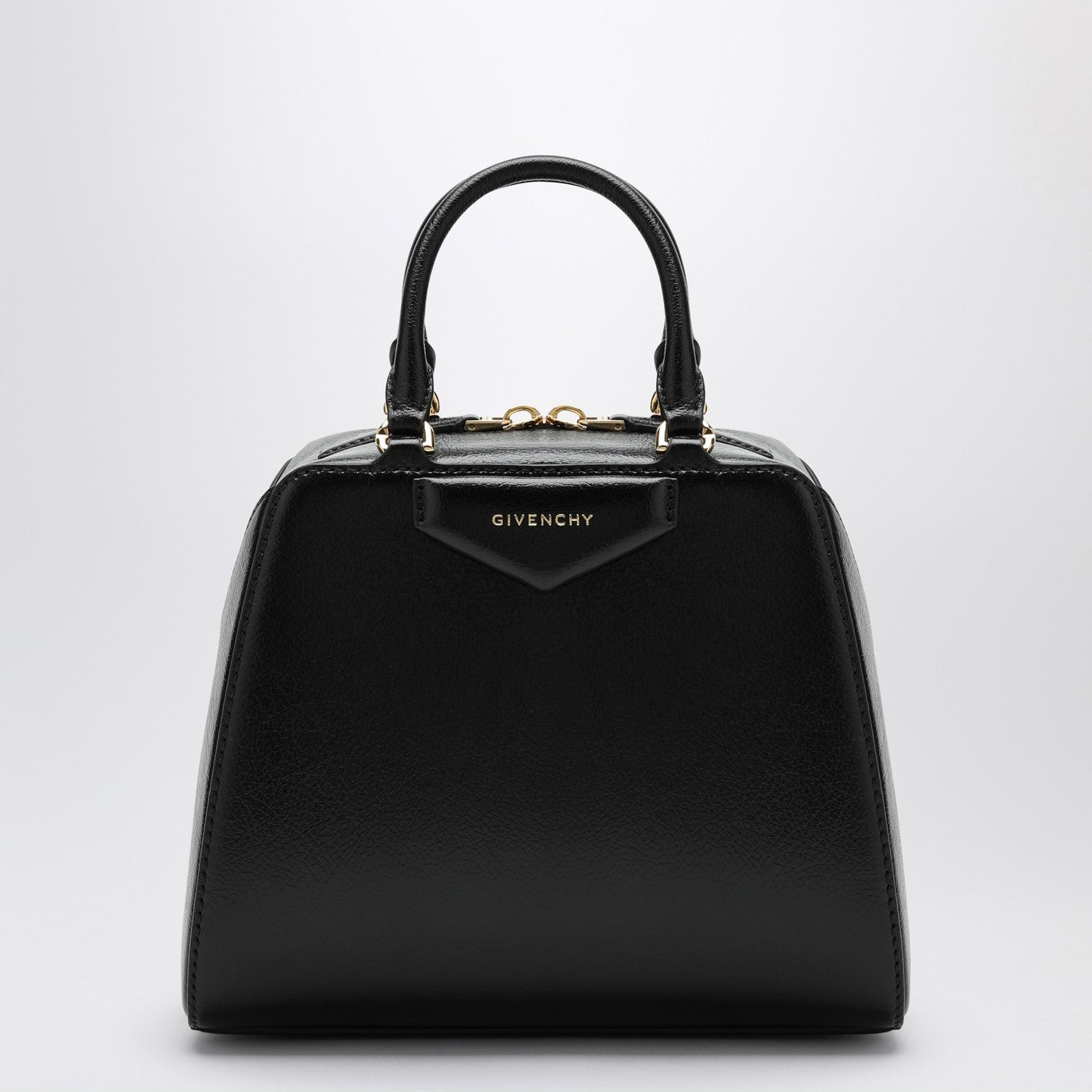 Mini borse in pelle nera lucida in pelle di bufalo di Givenchy con una forma del cubo, una doppia chiusura a doppia zip logo, una tracolla regolabile e staccabile, logo di lettere sulla parte anteriore, logo 4G sul retro, hardware in metallo tono in oro, un compartimento principale e una tasca piatta interna.