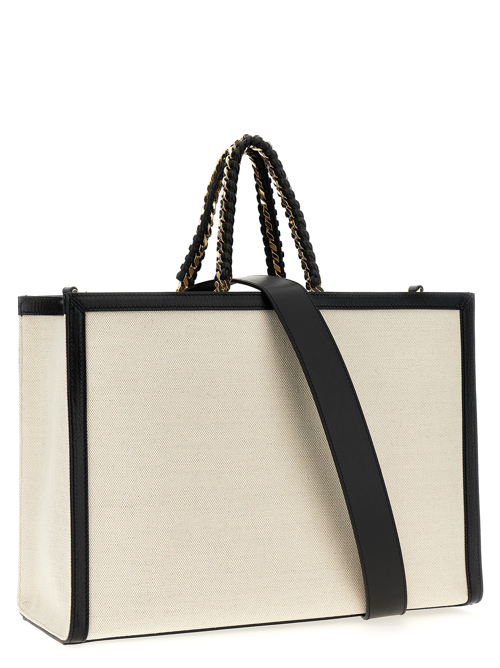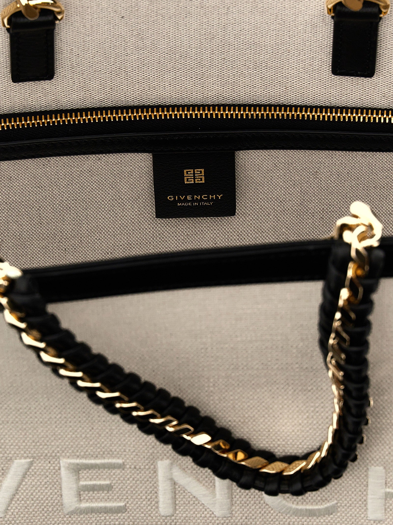 Borsa per la spesa di medio -g in tela e pelle, ricamo a logo anteriore, maniglie a catena e pelle, spalla in pelle rimovibile.