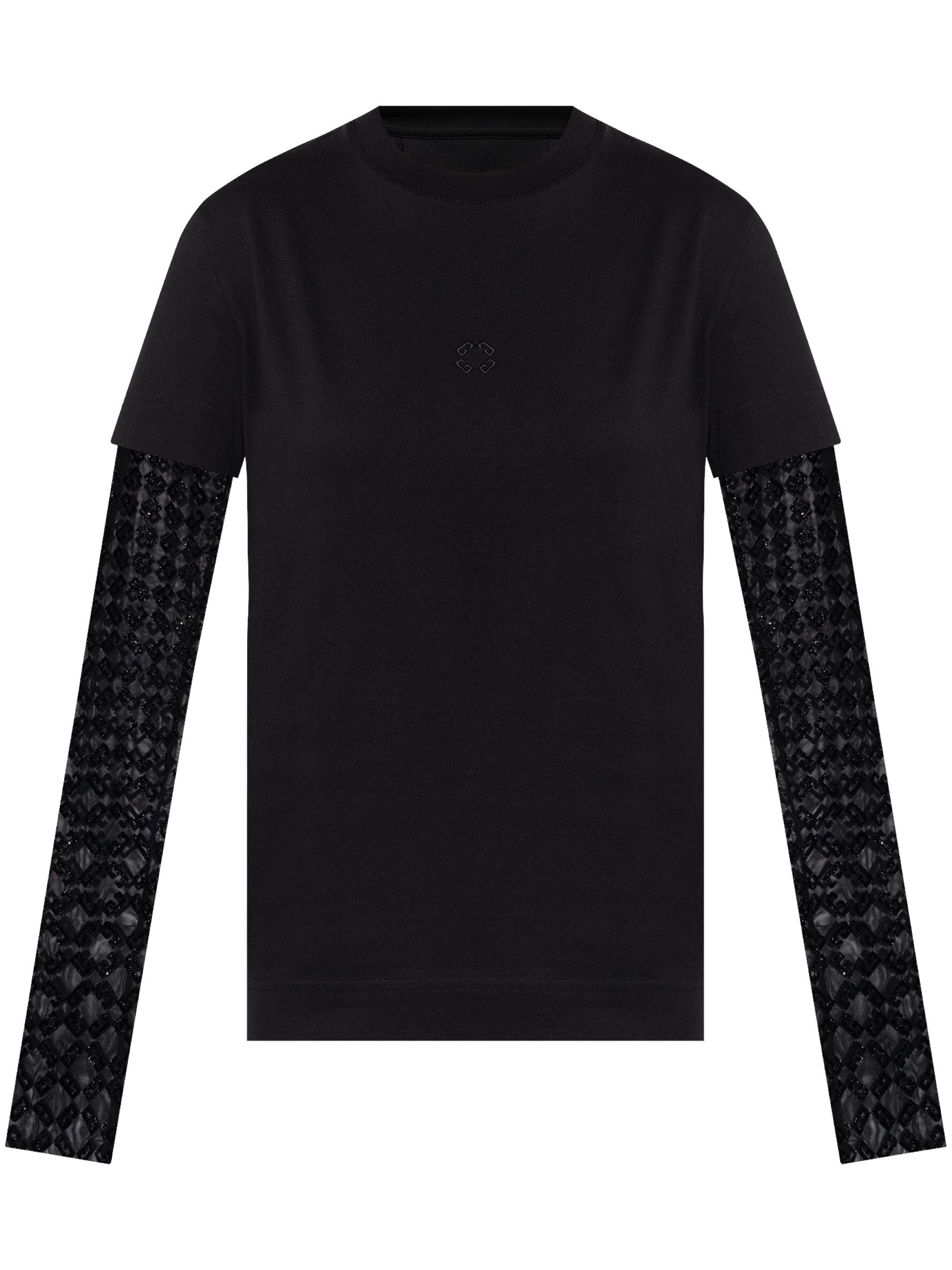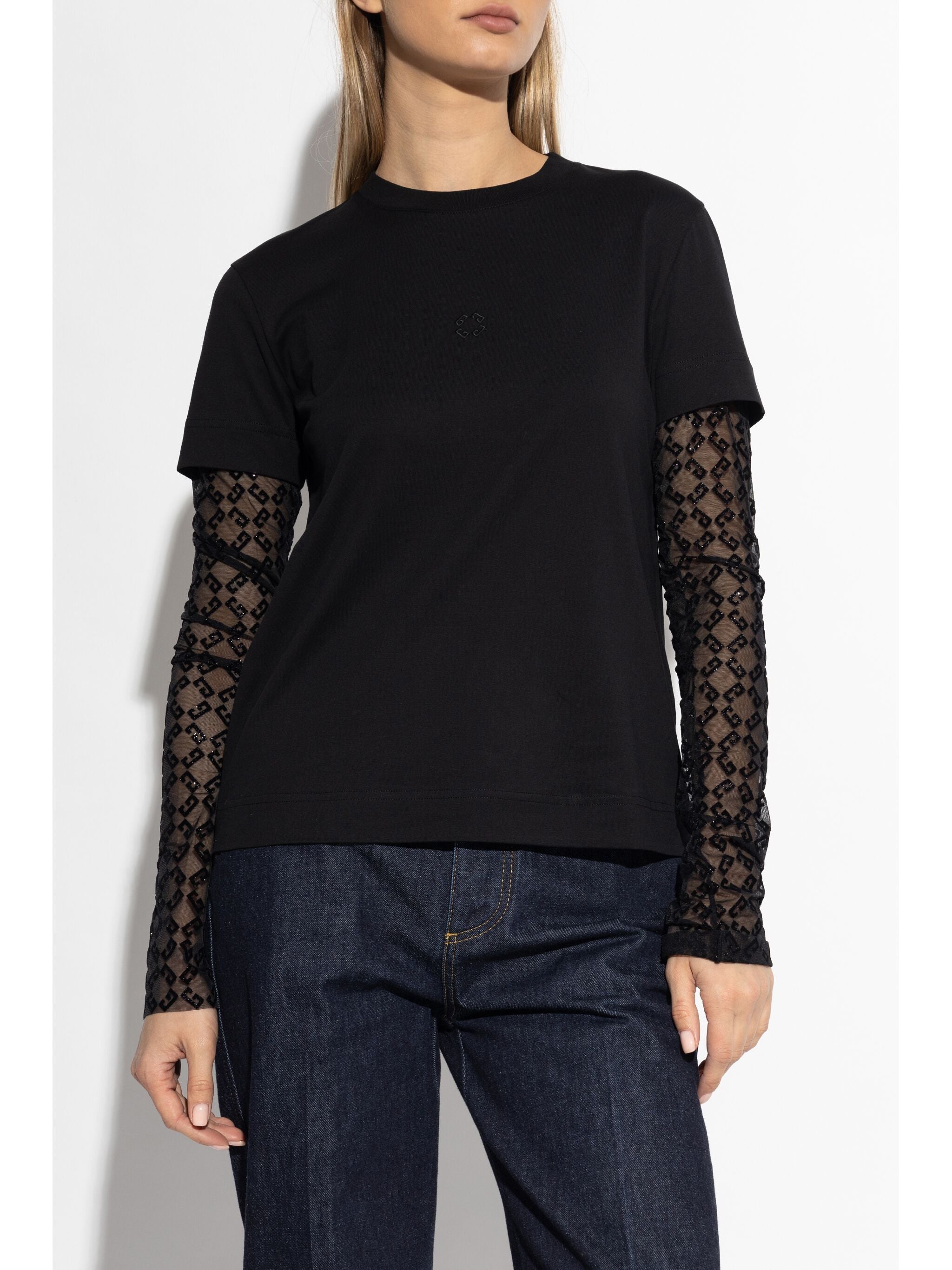 Questa maglietta a maniche lunghe, realizzata in cotone e tulle, è caratterizzata dall'effetto sovrapposto che crea un design elegante e dinamico. Le maniche di tulle con il pattern di velluto robusto lucido Monogram 72 aggiungono un dettaglio sofisticato, mentre il piccolo logo 4G ricamato sul anteriore segna il modello con un tocco iconico.
