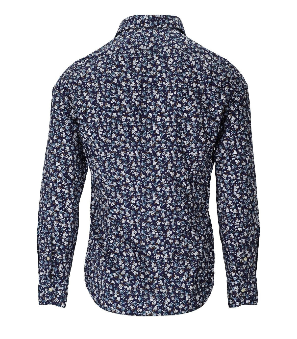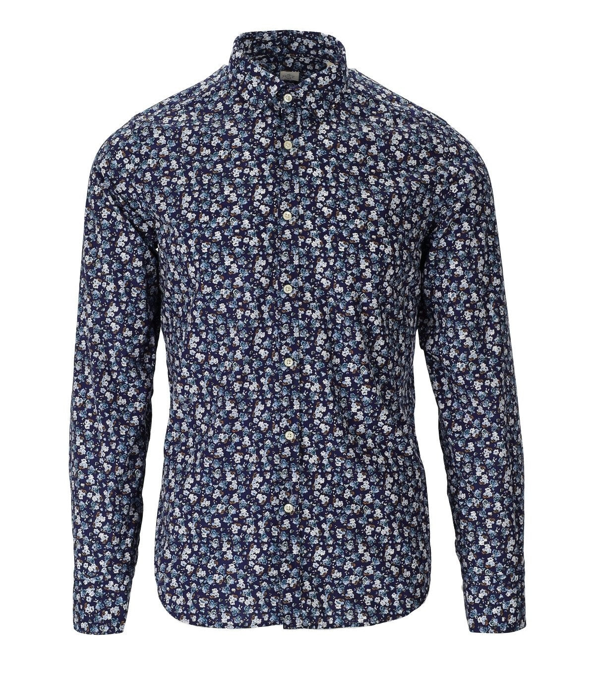 Camicia GMF 965 in cotone blu con stampa floreale in sfumature di bianco, blu e marrone. Slimt fit.