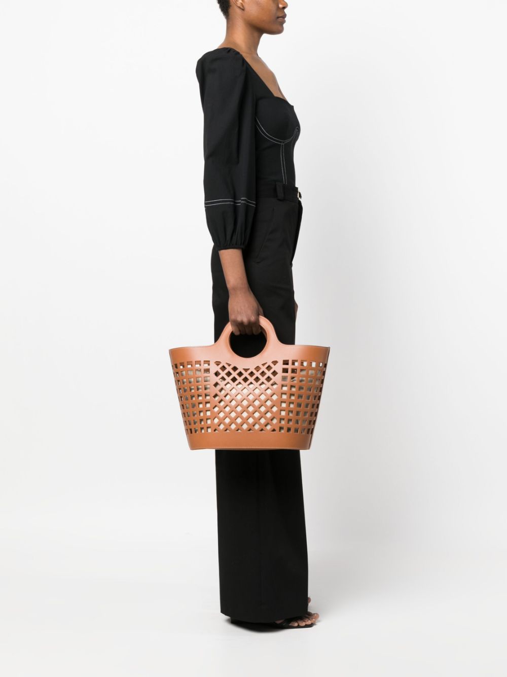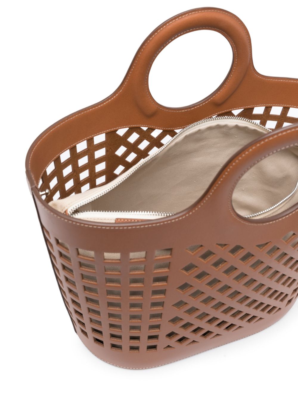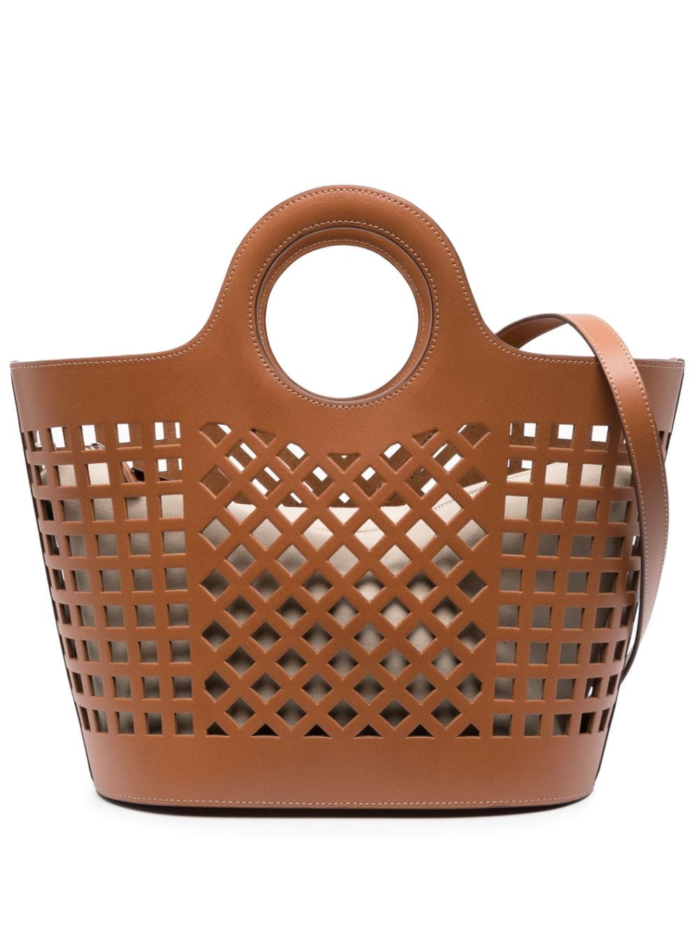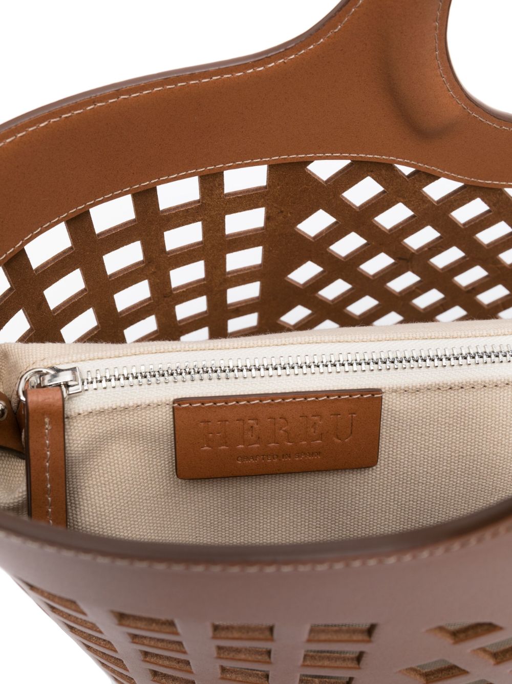 Tote Bag di COLMADO da qui con marrone cammello, pelle di vitello, dettagli ritagliati, top aperta, spalline staccabile regolabile, maniglia superiore ritagliata, busta rimovibile e scomparto principale.