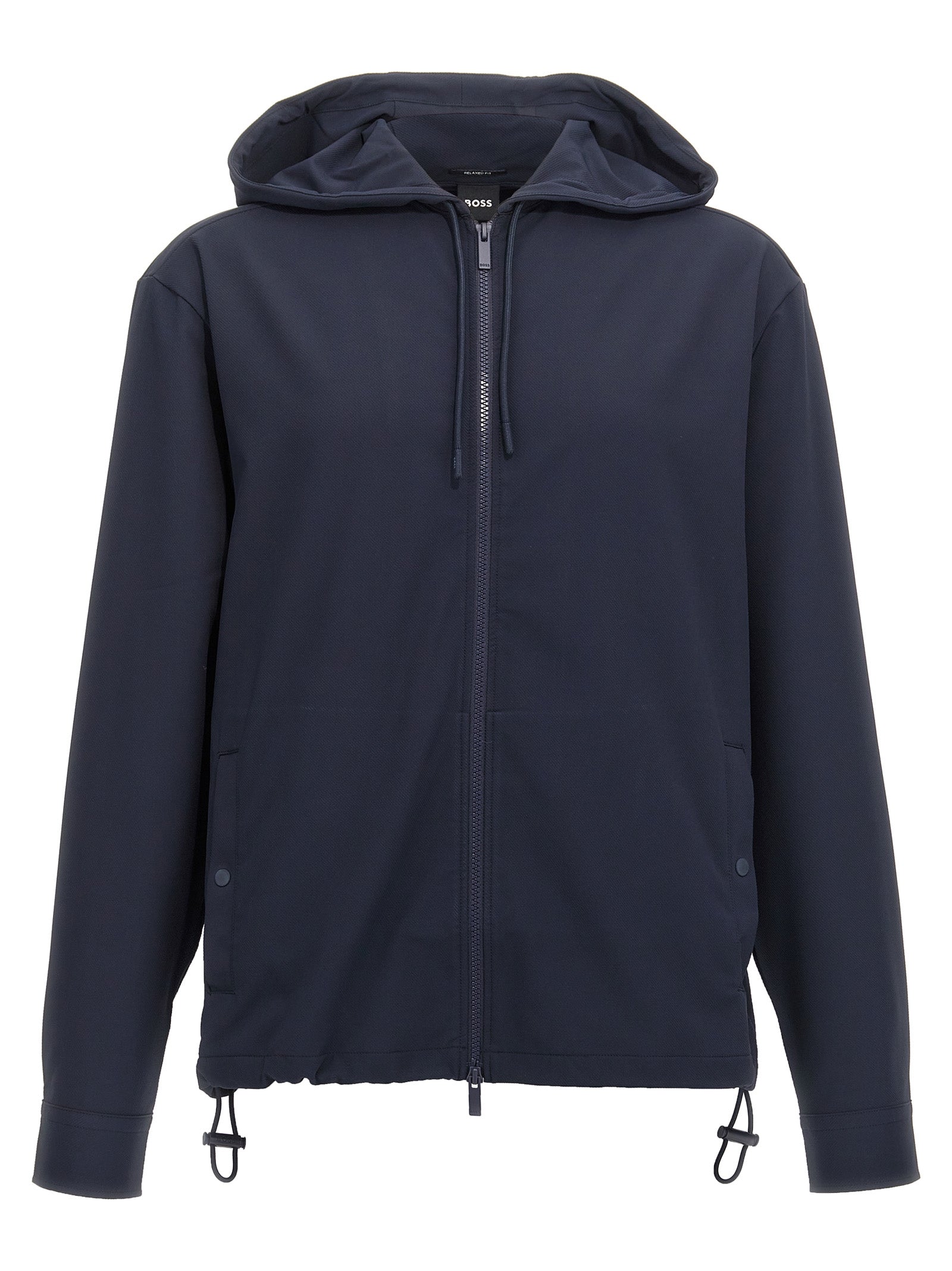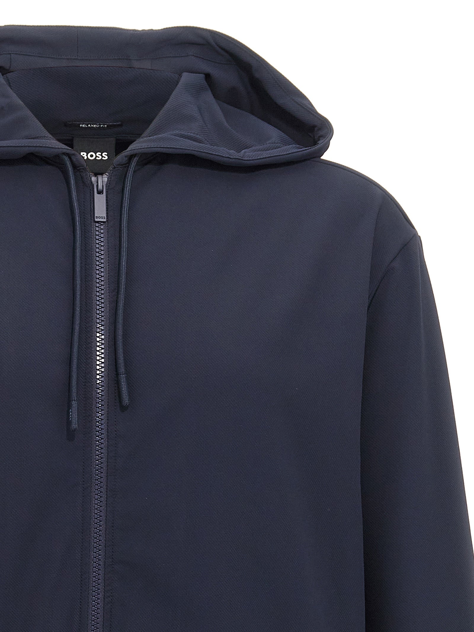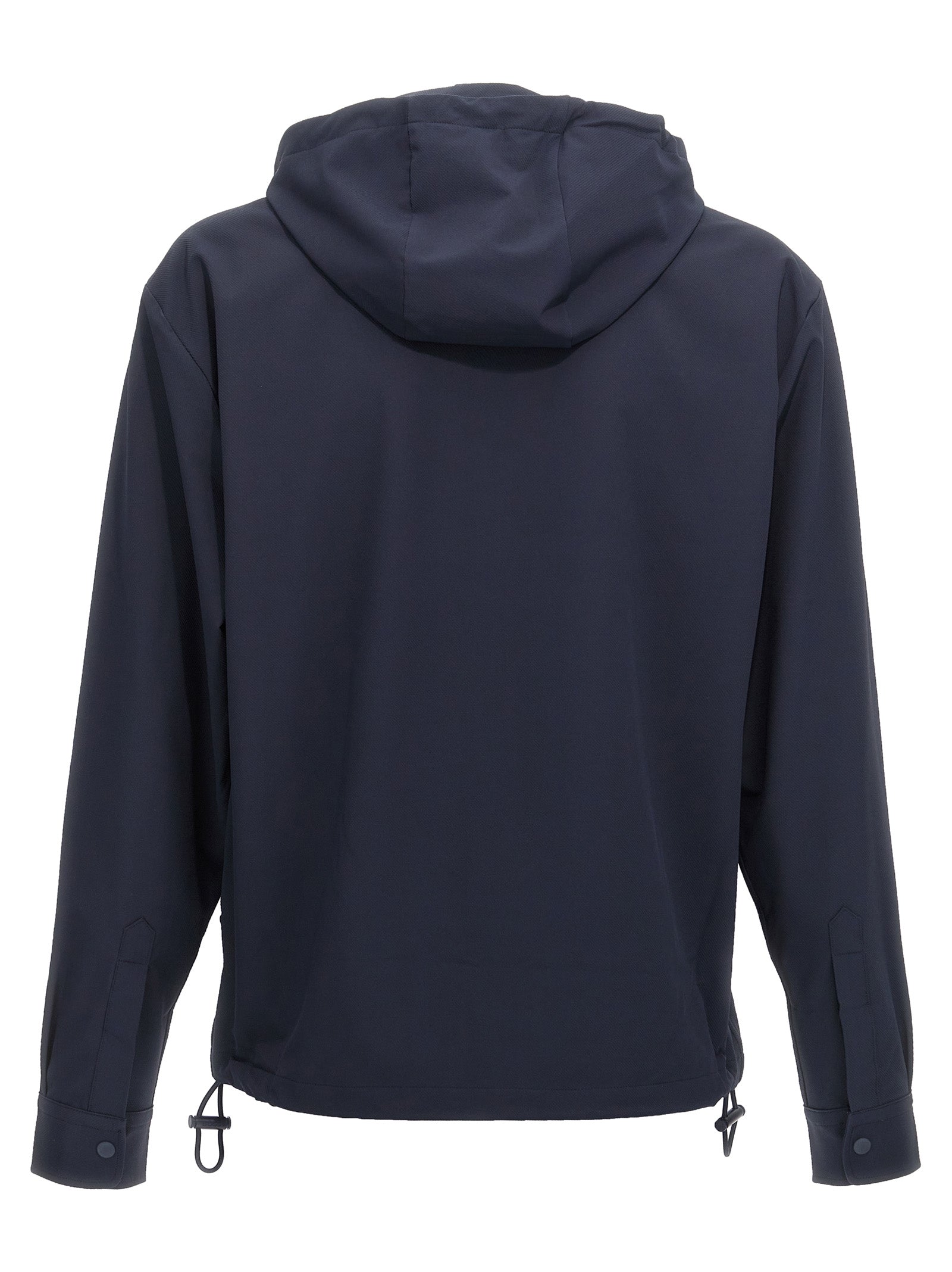 Hoodie "Olson Hood" in tessuto tecnico con chiusura a zip anteriore, tasche laterali con bottoni a scatto, maniche lunghe con polsini e pulsanti.