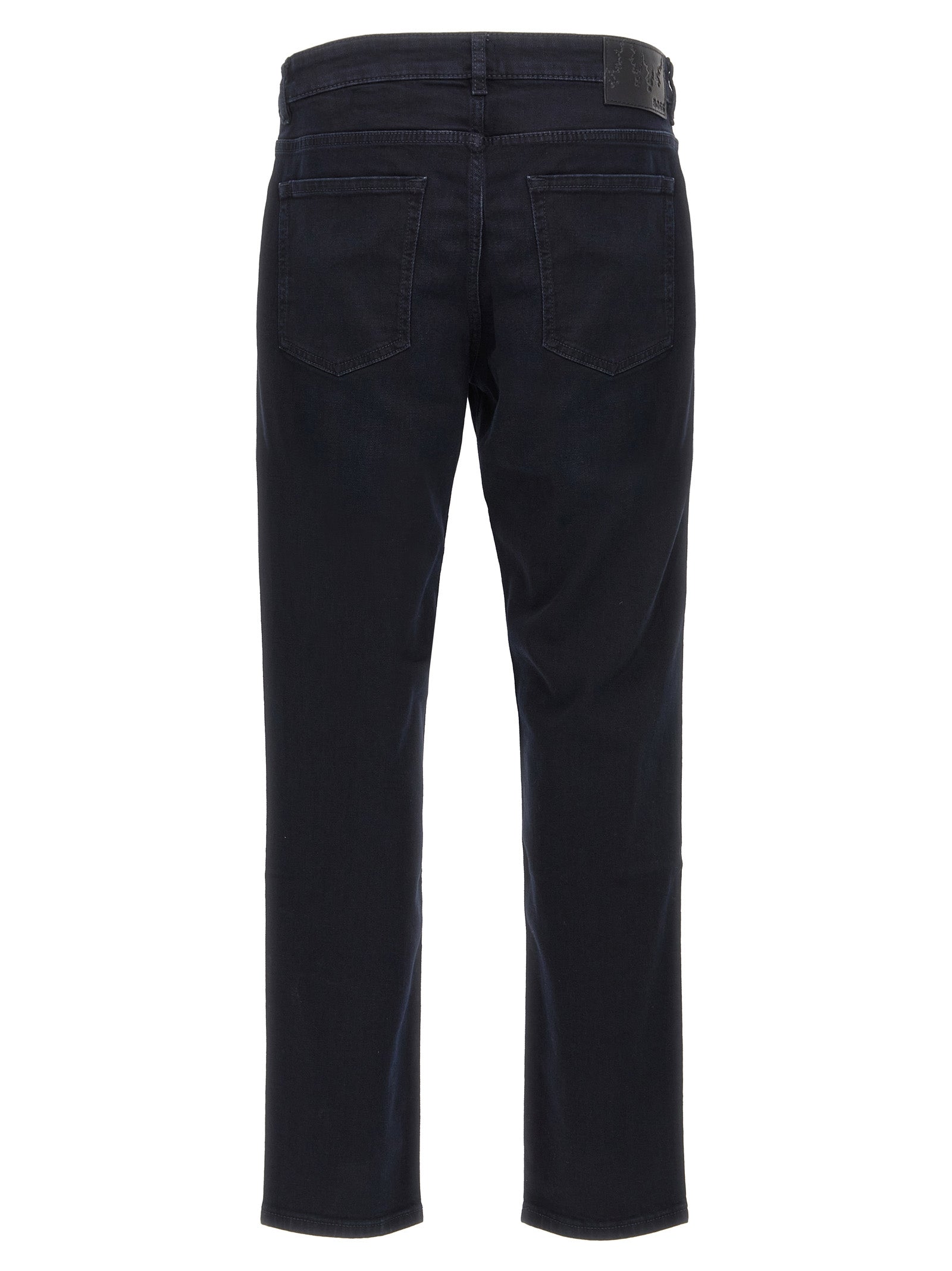 Jeans in denim in cotone "re Maine", cinque tasche, chiusura a zip e bottoni, gamba dritta, etichetta logo in pelle sul retro.