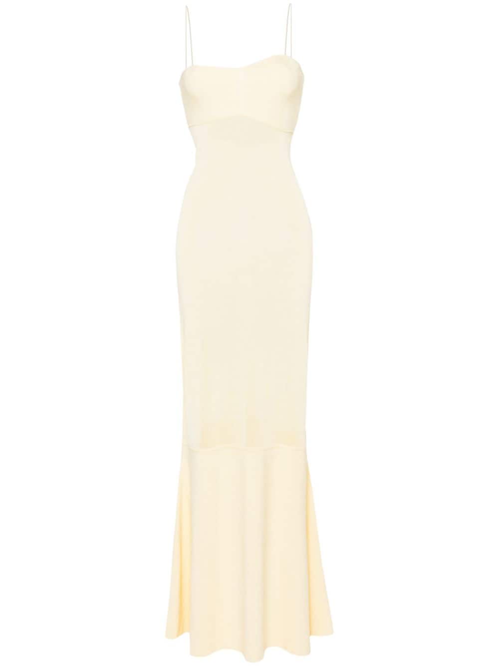 Design a sirena per costruzione a maglia giallo chiaro spalline spaghetti spalline maniche a cuore a cuore lunghezza lunghezza fessura posteriore orlo dritto orlo oro