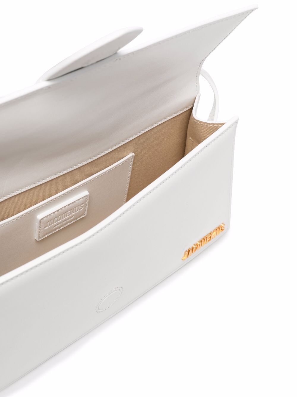 Pelle in pelle bianca luminosa Le Bambino Long Tote Bag di Jacquemus con hardware tono in oro, placca logo, tracolla singola e top pieghevole con fissaggio magnetico.
