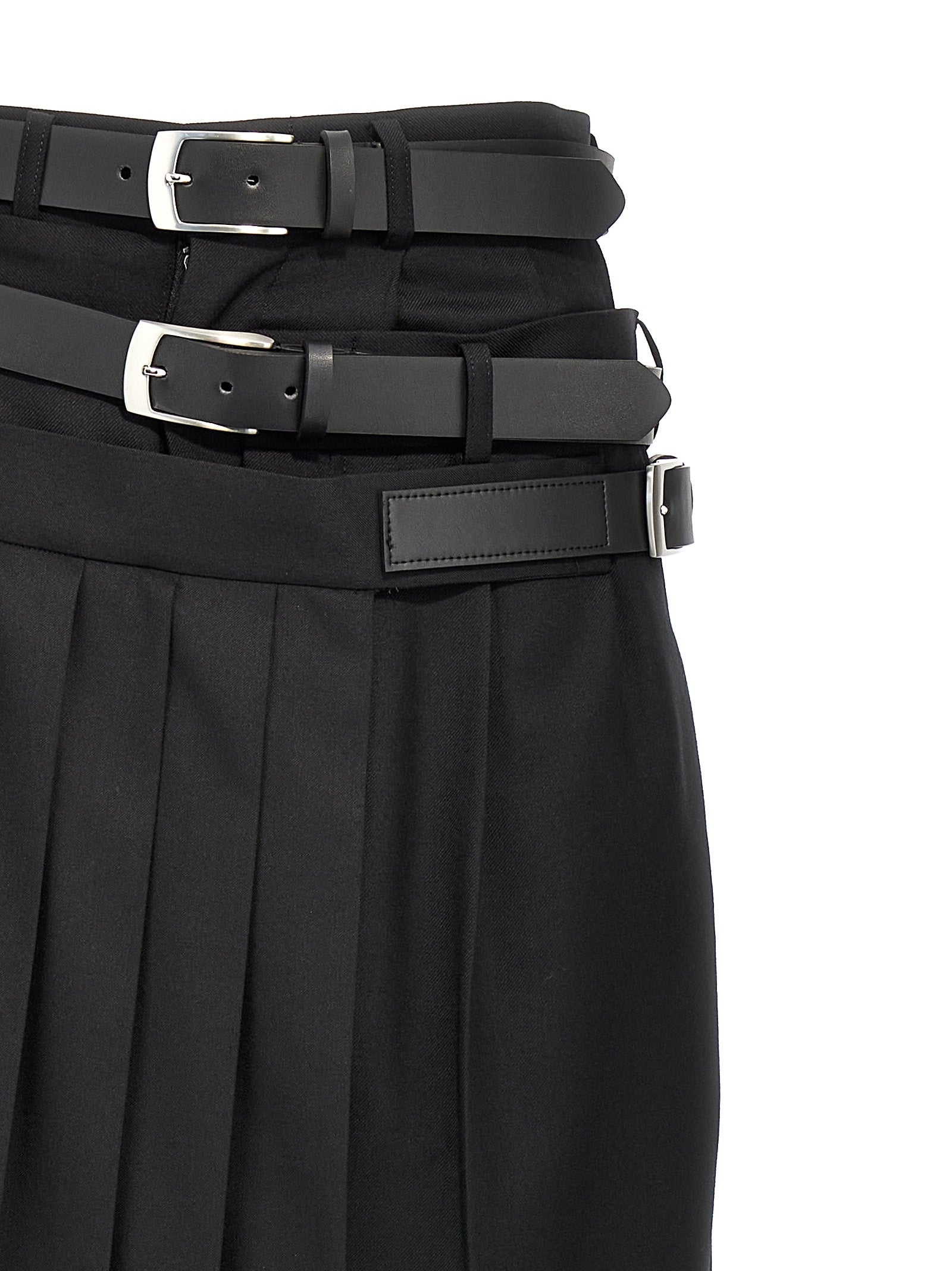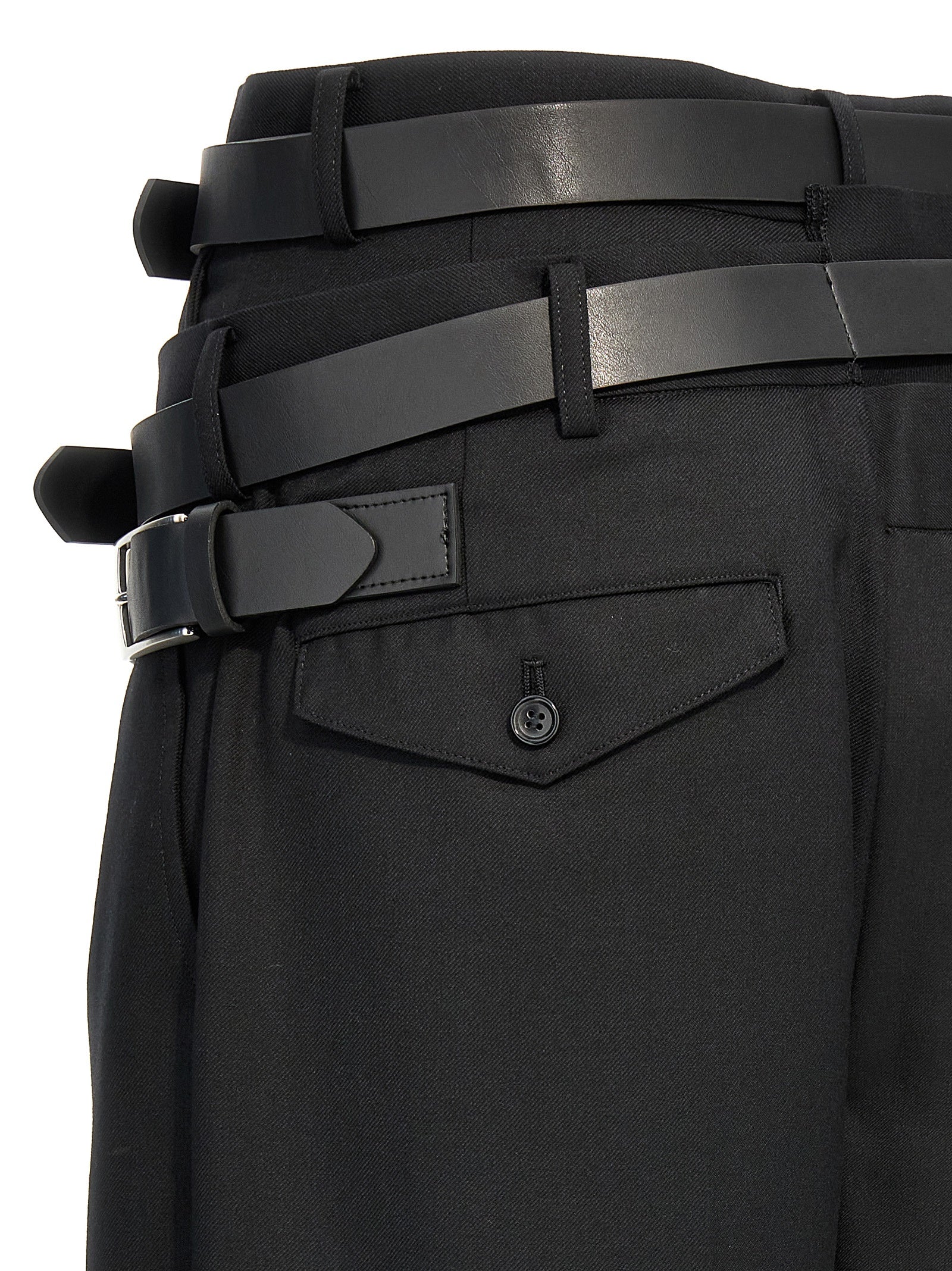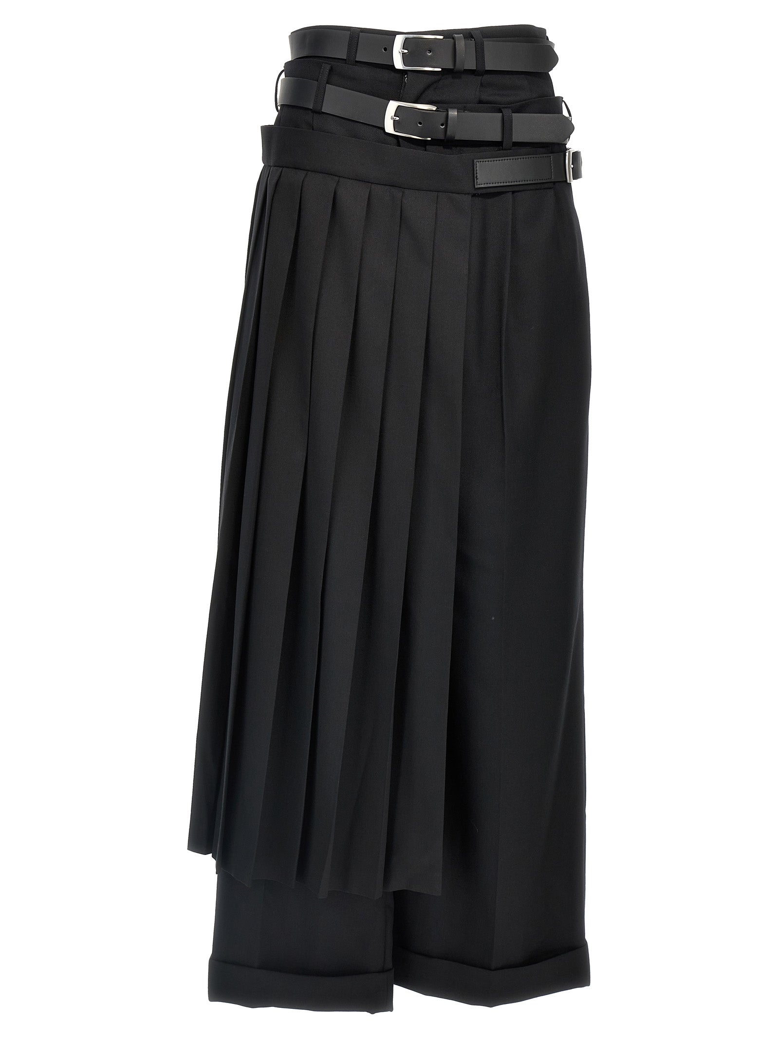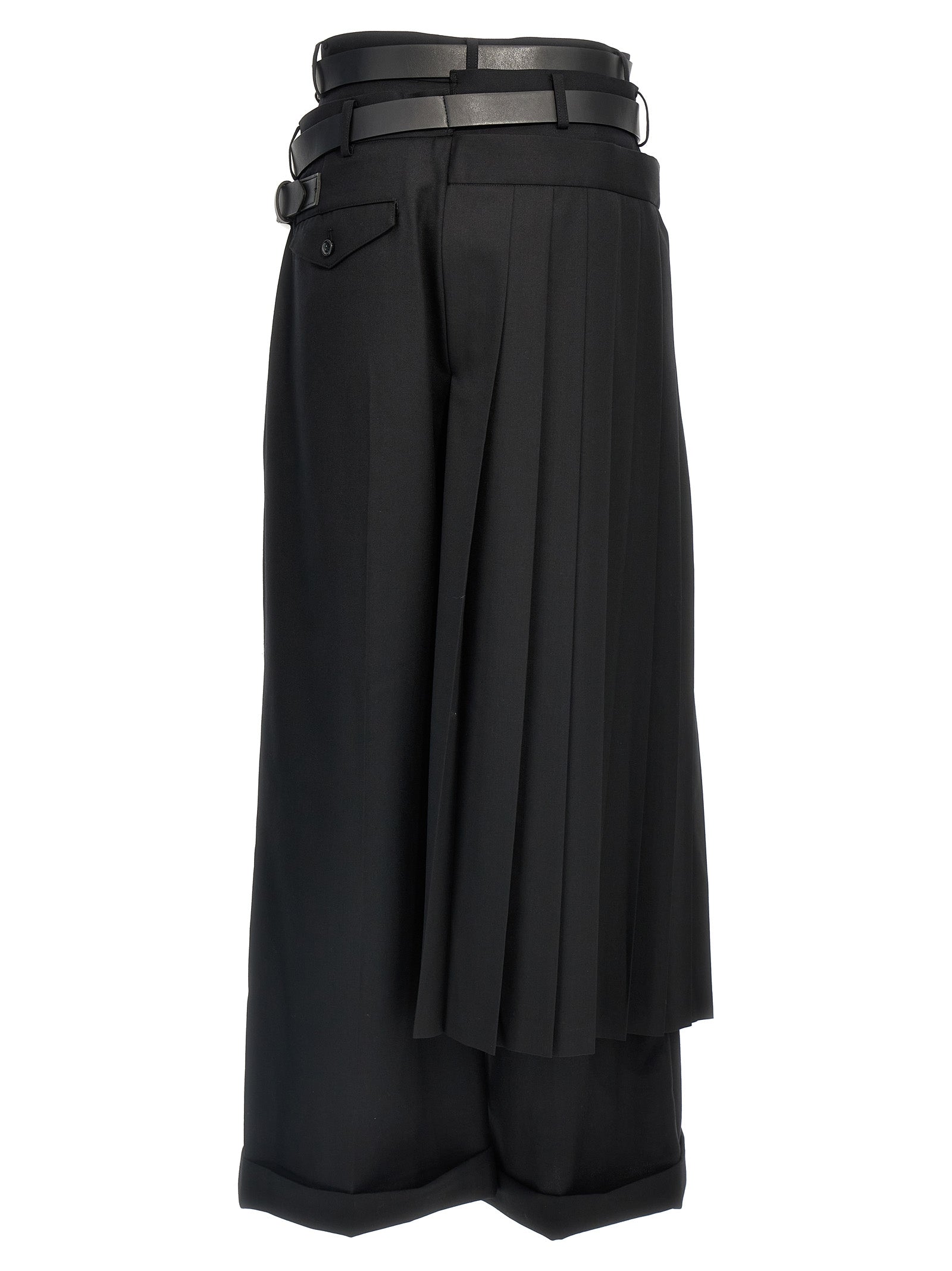 Pantaloni di lana con chiusura con zip e gancio, tasche, gamba larga con orlo alzato, inserto in tessuto a pieghe sul lato e cinture regolabili in vita.