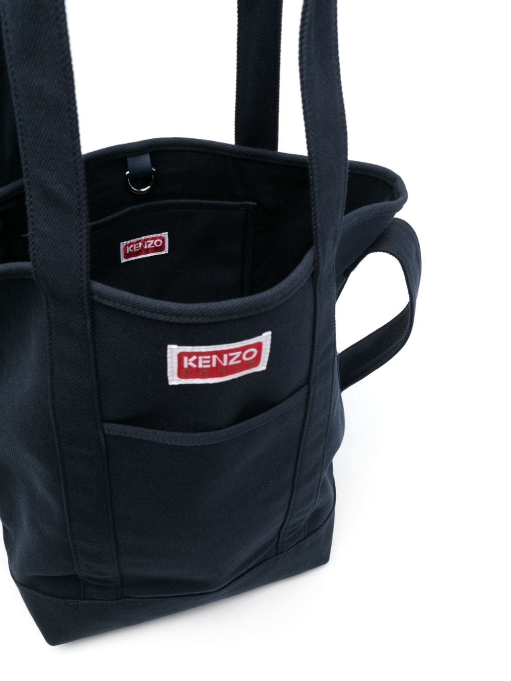 Boke Flower Motf Tote Bag di Kenzo con blu navy, cotone, tela, moto di fiori boke firma, patch logo sul retro, due maniglie superiore piatta, tracolla singola e compartimento principale.