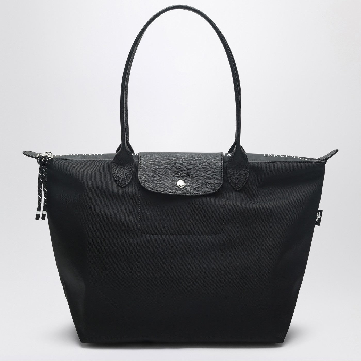 Borsa per la spesa di Longchamp in poliammide riciclata nera, con due maniglie superiori, una chiusura zip-bossed logo, un lembo con un pulsante a scatto, due tasche piatte interne e dettagli in pelle nera.