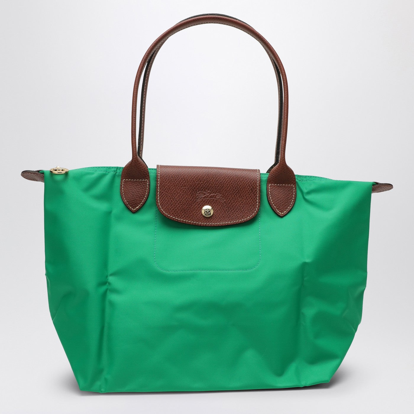 Borsa a tracolla media di Longchamp in tela poliammidica riciclata econyl verde con dettagli in pelle marrone, con due maniglie superiore, top pieghevole con chiusura magnetica, chiusura della cerniera e scompartimento principale.