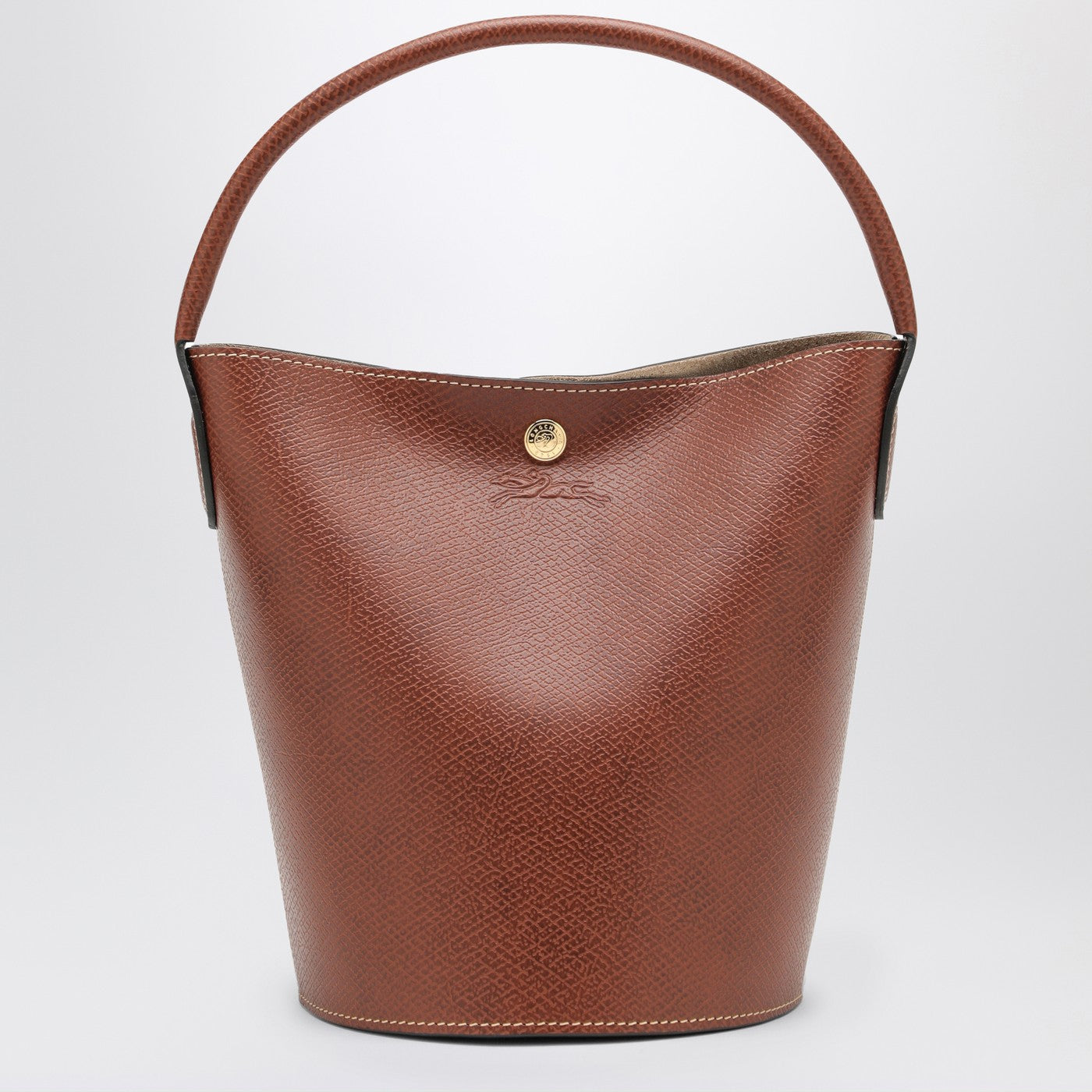 Brown leather bucket bag by Longchamp with press stud closure, golden inserts and interior flat pocket.
